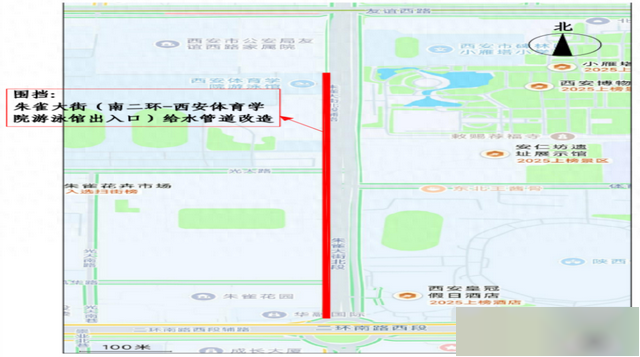 本次施工将占用朱雀大街(二环南路至西安体育学院游泳馆段)西侧由北向南方向辅道,围挡长900米,宽5米,工期为2025年11月26日至2026年2月5日,共计72天。施工期间,朱雀大街与风华路丁字、光大路丁字及沿线单位、小区出入口区域围挡将采用夜间施工(23:00—次日6:00),白天恢复通行模式。