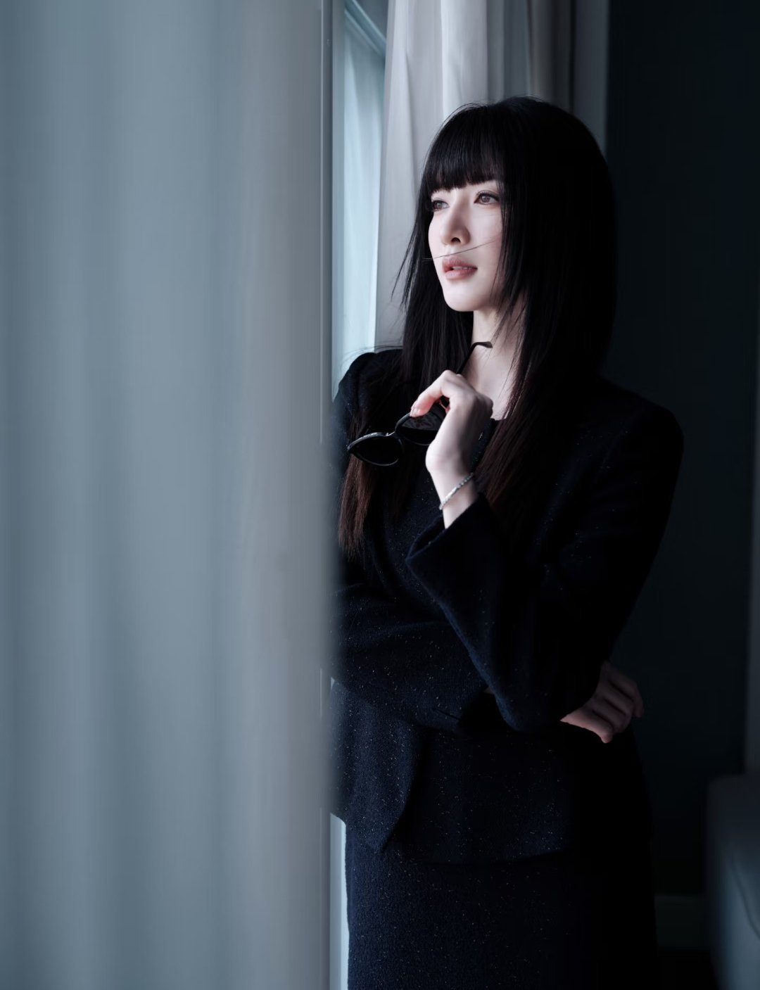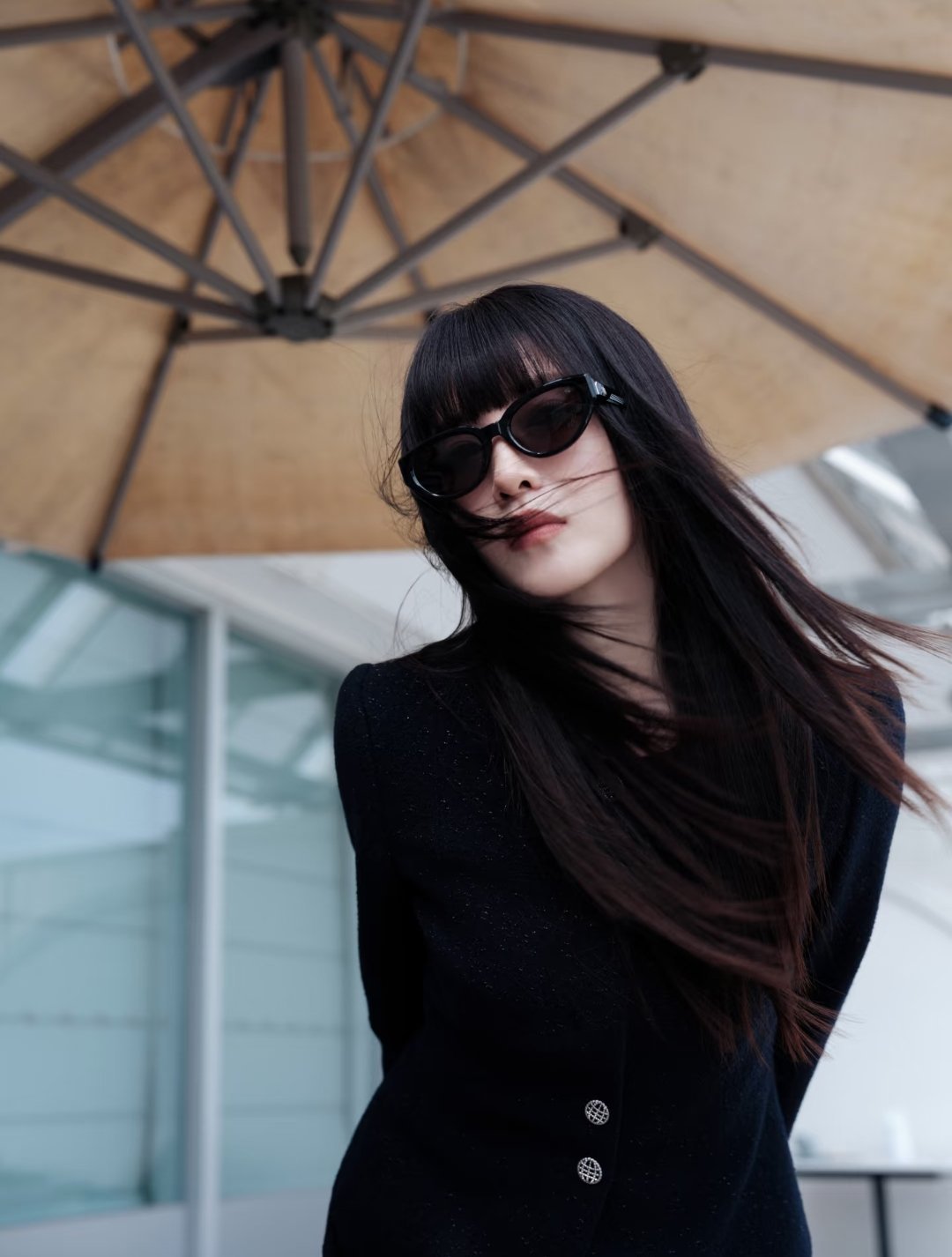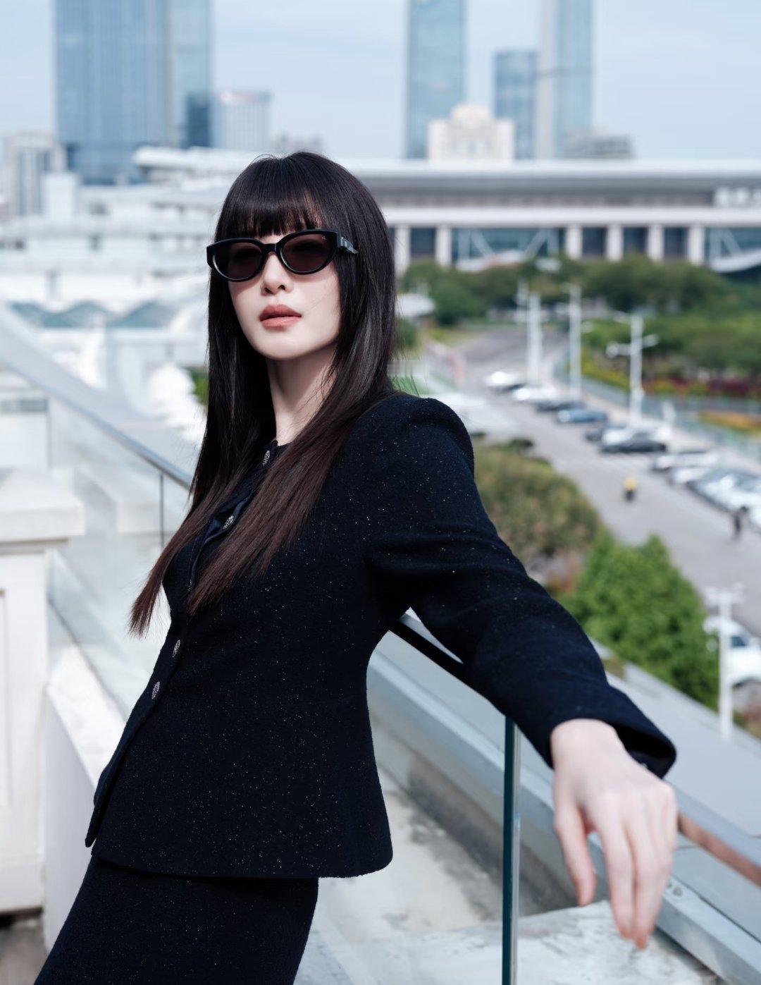 江疏影的一组齐刘海+黑色时尚穿搭图~
