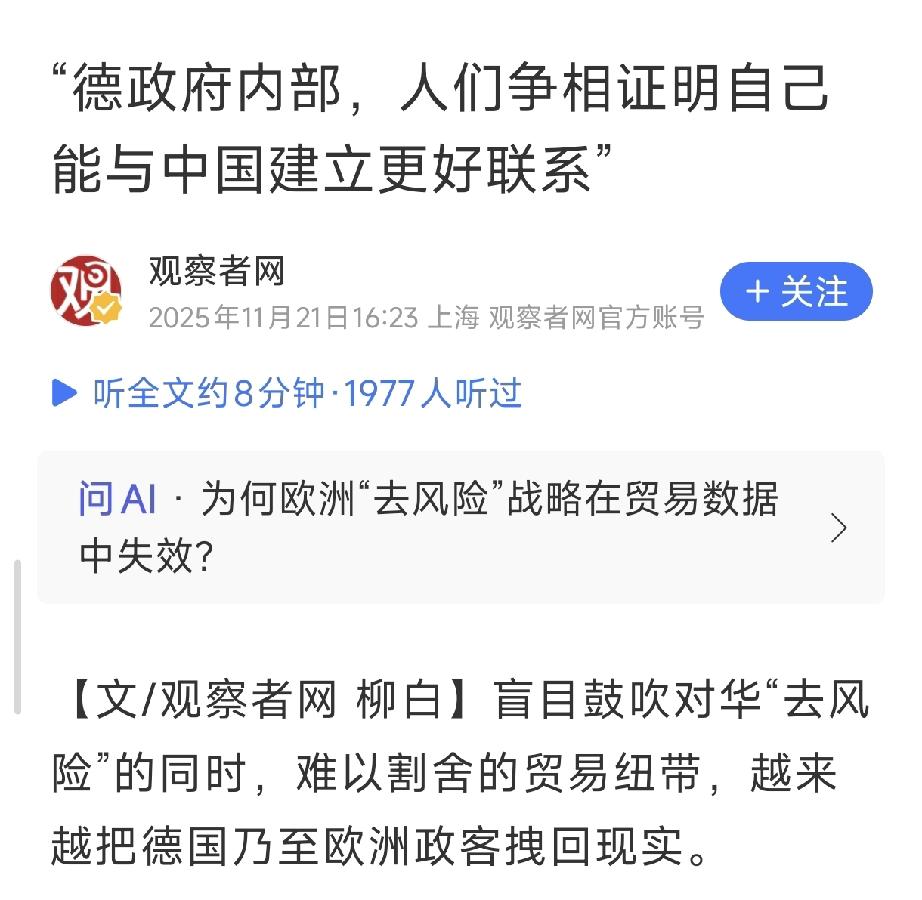 11月20日,德国媒体披露,在德国政府内部产生了一个怪异的现象,大家都想争着证明自己能与中国建立更好的联系。而当天,也刚好是德国财长兼副总经理克林贝尔结束为期四天的访华之旅。 德国媒体对克林贝尔的访华之行表示了赞同,称“克林贝尔是对的,彼此对话总比互相指责要好,他在中国找到了恰当的语气,没有采取居高临下的奢教态度。” 而克林贝尔表示,他这次中国之行取得的最大成就就是从中方获得了维持稀土和关键原材料供应的承诺,中方做出明确承诺,会确保可靠的获取渠道和供应链。 克林贝尔还表示:“我相信我能够为确保德中关系的良好做出贡献。” 而在此之前,欧洲的政客一直强调对华“去风险”政策,而最新的贸易数据却揭示了一个截然相反的现实,欧洲经济对中国的依赖正变得前所未有的深。 根据最新数据,2025年1-9月中国已超越美国成为德国最大贸易伙伴,双边贸易额达1859亿欧元。值得注意的是,德国对华进口同比增长8.5%,但出口下降12.3%,反映出结构性变化。 德国财长克林拜尔刚结束访华,双方达成27项共识,包括关键原材料供应保障。尽管欧洲推行"去风险"政策,但数据显示中国对欧盟贸易顺差已达3100亿美元,创历史新高。 有分析人士认为,这一趋势反映了欧洲“去风险”战略的局限性,中国对德国的贸易影响力已重新回到了巅峰。德国外长 德国对话中国 德国稀土困局