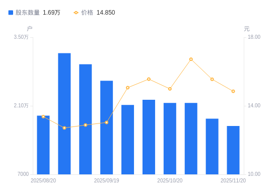 近一年(2024年11月29日至2025年11月20日),智动力A股股东户数从2.21万户,减低至1.69万户,降幅23.61%,区间股价上涨58.99%。