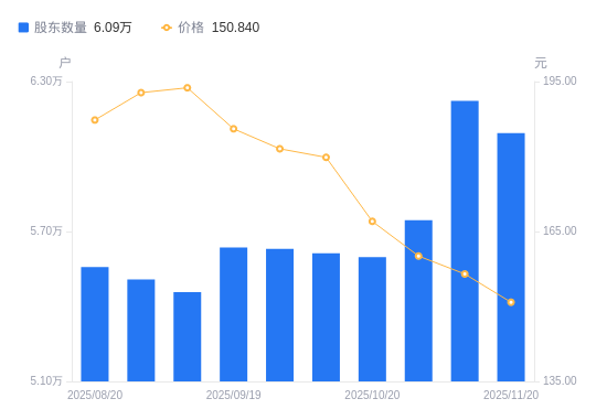 日期A股户数(户)流通A股户均持股数(股)户均持股市值(万元)2025-11-20609413422.8451.632025-11-10622283352.0552.462025-10-31574483630.9658.132025-10-20559763726.4562.242025-10-10561263716.4966.842025-09-30563073704.5467.262025-09-19563633700.8668.672025-09-10545753822.1174.062025-08-29550783787.2073.012025-08-20555753753.3370.30
