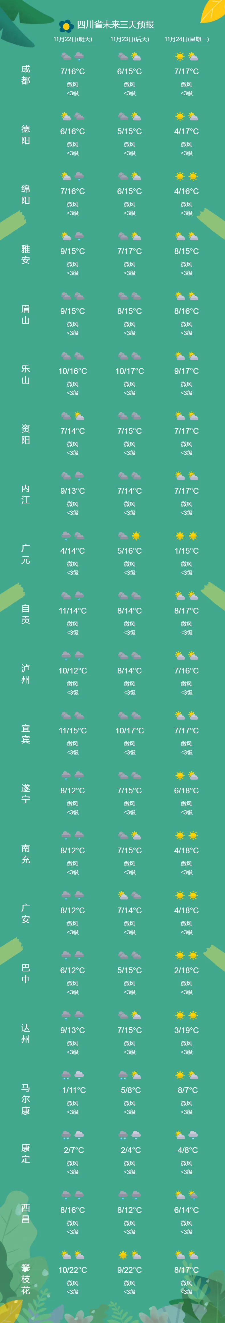 不过,根据目前的气象资料分析来看,太阳公公只是打算趁周末偷个懒,下周一就回来上班。预计到星期一(24日),四川盆地除南部阴云多些以外,其余地方将转为多云间晴的天气。