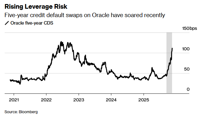 投资者的担忧在相关金融衍生品上体现得淋漓尽致——反映杠杆风险的甲骨文五年期信用违约互换(CDS)已飙升至三年来的最高水平。对此,EasterlyEAB全球宏观策略师ArnimHolzer表示:“看到甲骨文的CDS上升不应该令人惊讶。这些公司正在投入巨额资金并承诺进行巨额资本支出,其中一部分将通过债务融资。这并不意味着甲骨文的股票是垃圾,但它应该会波动更大。”