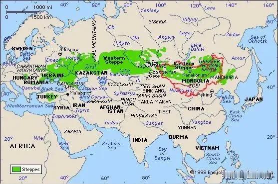 欧亚草原分布图,怪不得古代北方的游牧民族这么顽强,被打跑了过不了多久就能东山再起,地域辽阔、战略空间大,打不过就先勾起了发育,起来了再打,不行就抢一波就跑! 蒙古国西征虽然最初是被迫征讨花剌子模引起的,但也是基本验证草原分布带在打,毕竟地形、环境、生活方式都熟悉,套路熟悉,一路打一路抢,直接干到欧洲匈牙利,算是冷兵器时代的巅峰吧,农耕文明就很难做到!