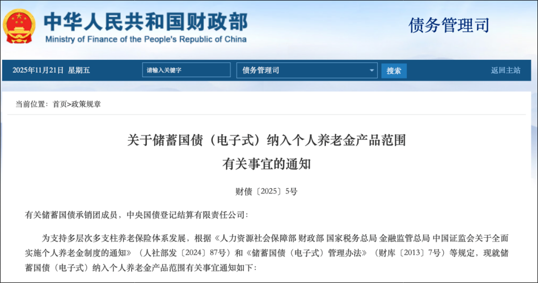 11月21日,财政部对外发布通知,为支持多层次多支柱养老保险体系发展,将储蓄国债(电子式)纳入个人养老金产品范围。