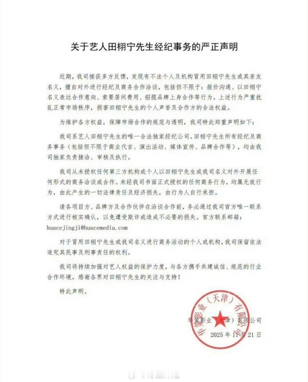 华策那边发了一个关于田栩宁的声明,原来是会发声明的,只是对于恋情瓜视而不见,这次