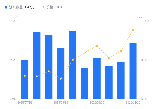日期A股户数(户)流通A股户均持股数(股)户均持股市值(万元)2025-11-201465715386.1015.862025-10-311221818457.5216.062025-10-201169119289.5415.742025-09-301273617706.8216.112025-09-191154019541.9416.752025-09-101623213893.1711.162025-08-291401816087.4610.572025-08-081566814393.2910.262025-07-311613713974.979.432025-07-181253617989.3112.21