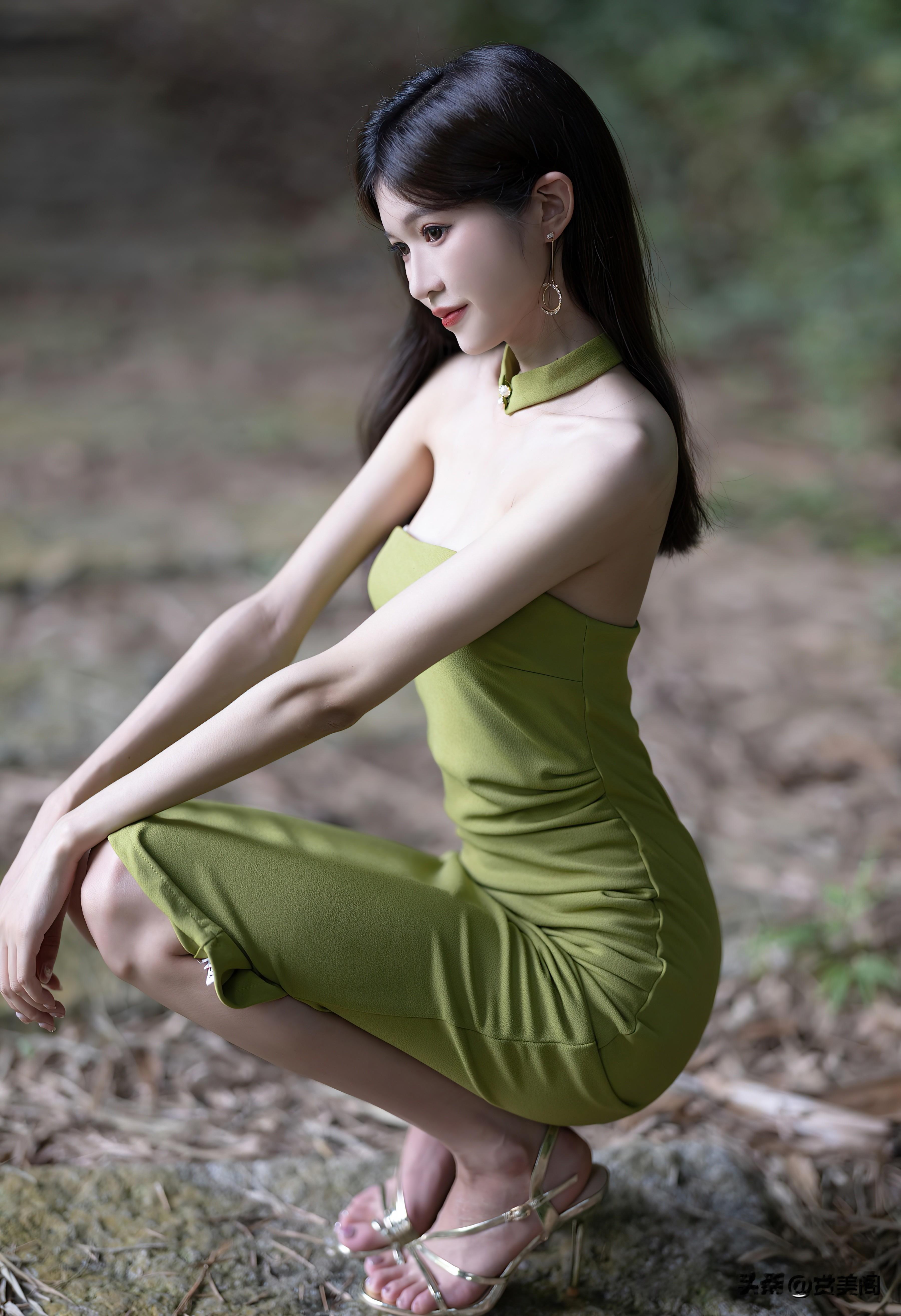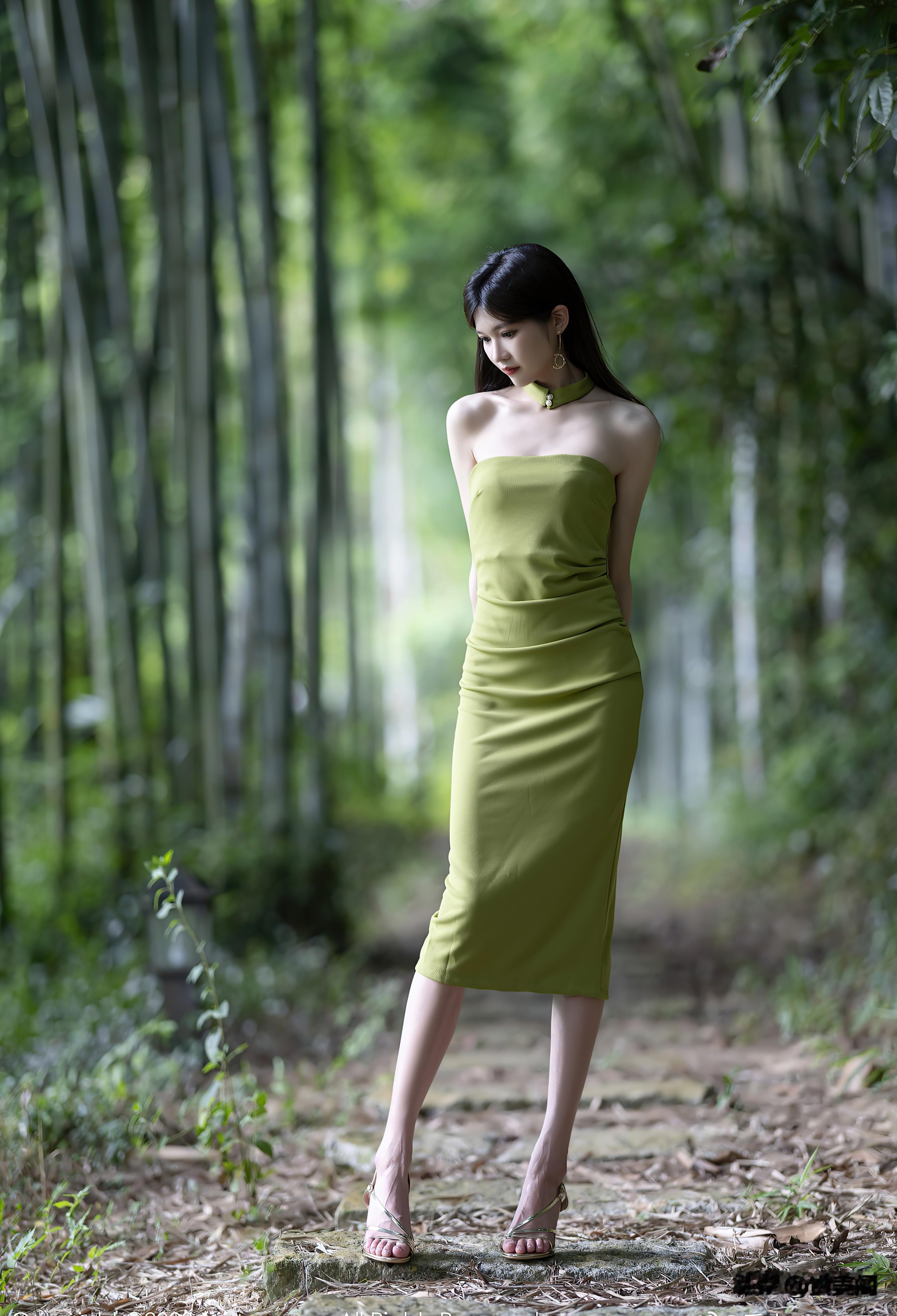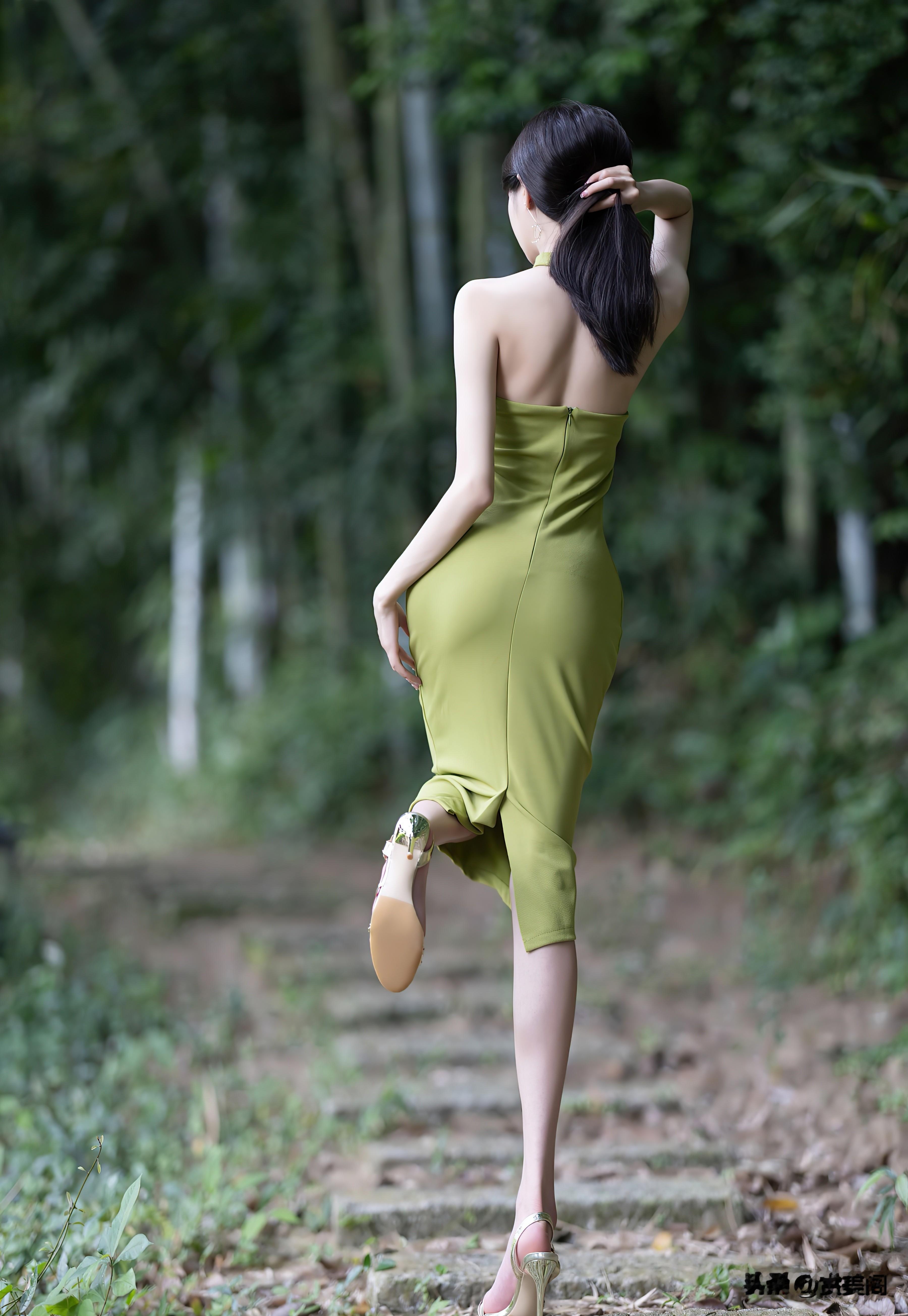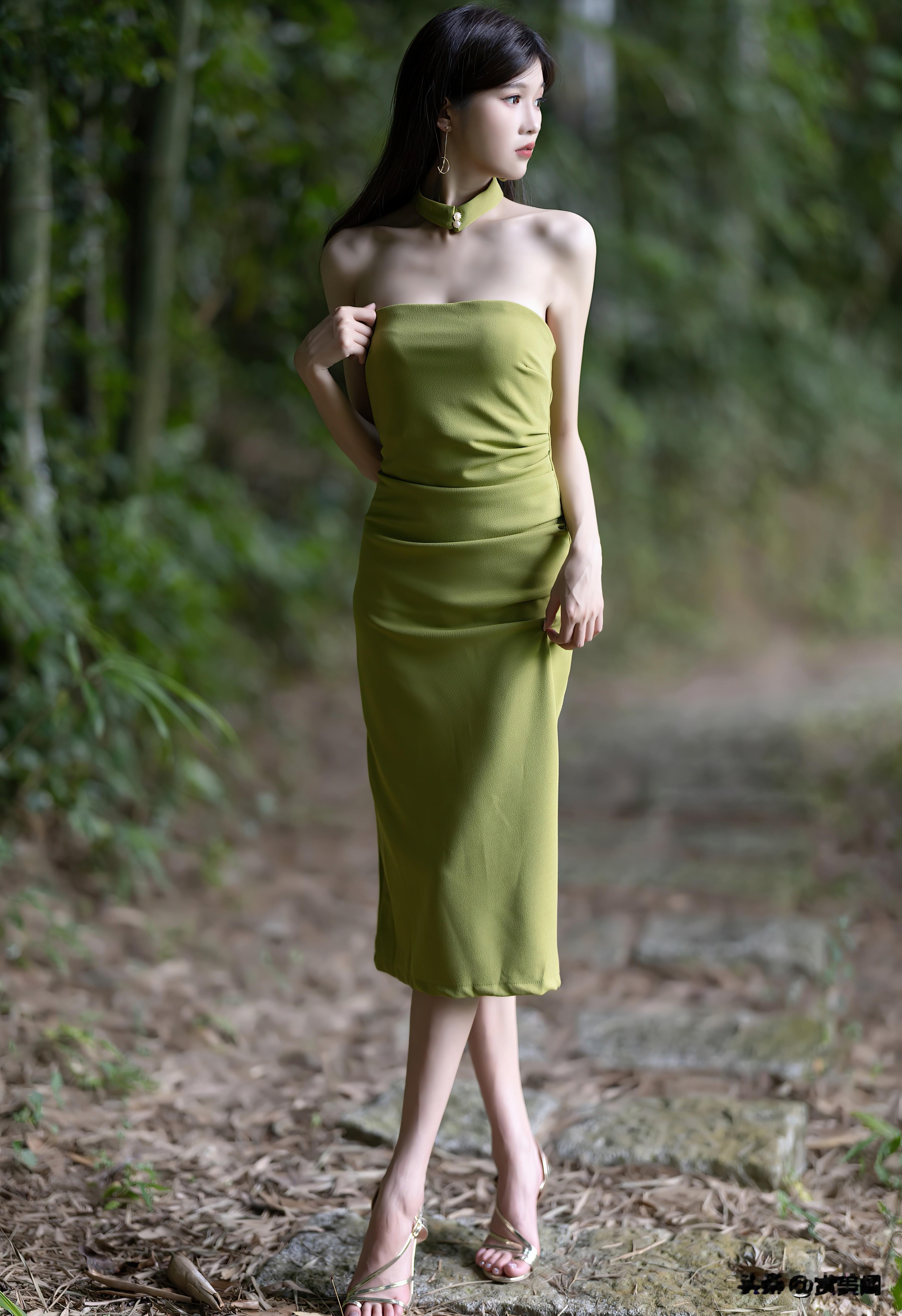室外美女摄影写真|抹茶绿色抹胸连衣裙,颜色清新,展现出优美的肩部和颈部线条,勾勒出曼妙的身材曲线,裙子长度至膝盖附近,端庄又不失时尚感。浅色细带高跟凉鞋,细带设计简约时尚,露出脚部肌肤,在视觉上拉长腿部线条,使腿部看起来更加修长。 欣赏模特的同时也应该赞叹一下摄影师深厚的的功力。——程程程