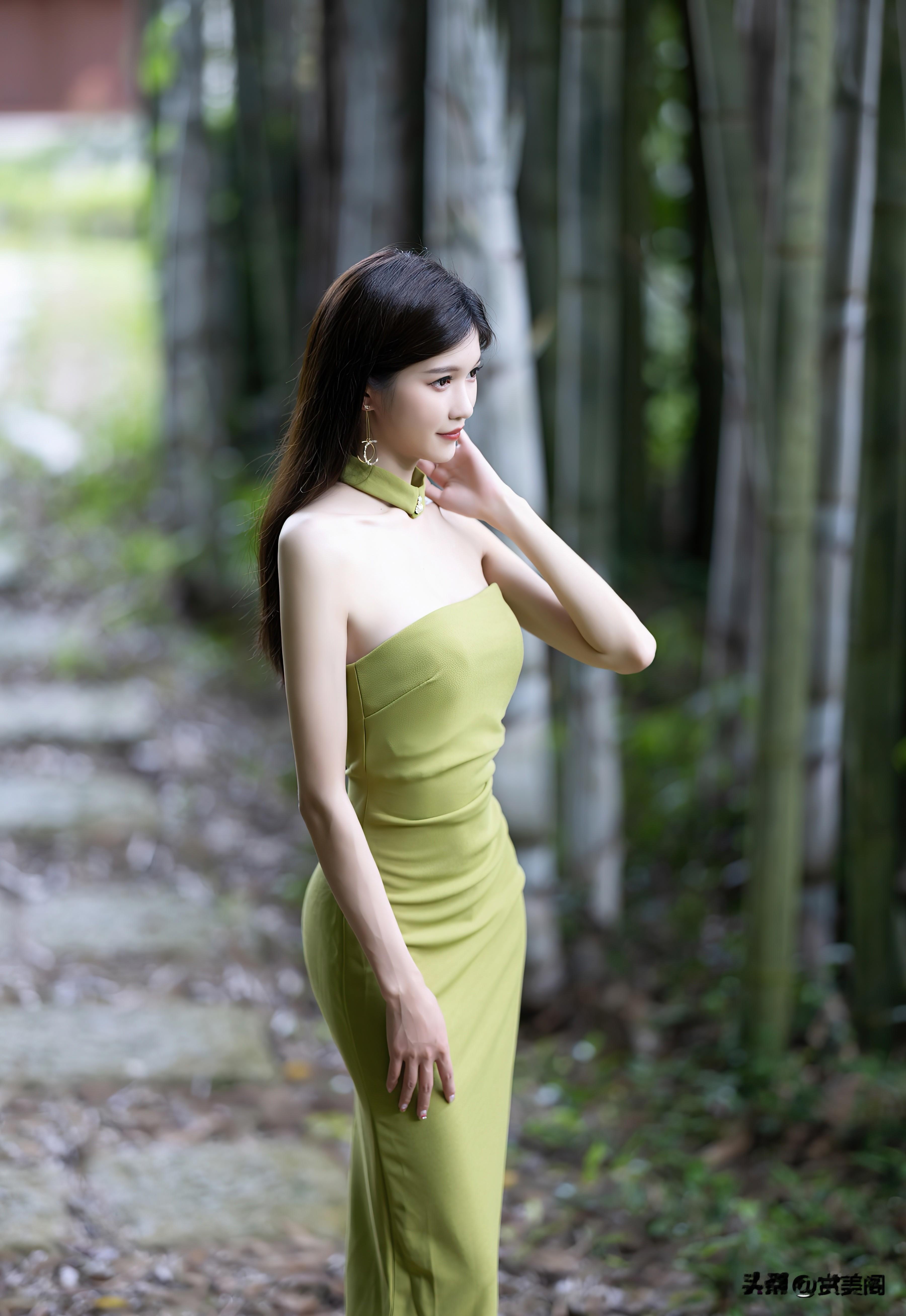 室外美女摄影写真|抹茶绿色抹胸连衣裙,颜色清新,展现出优美的肩部和颈部...