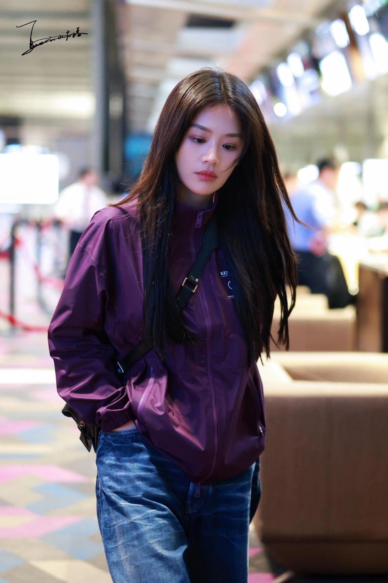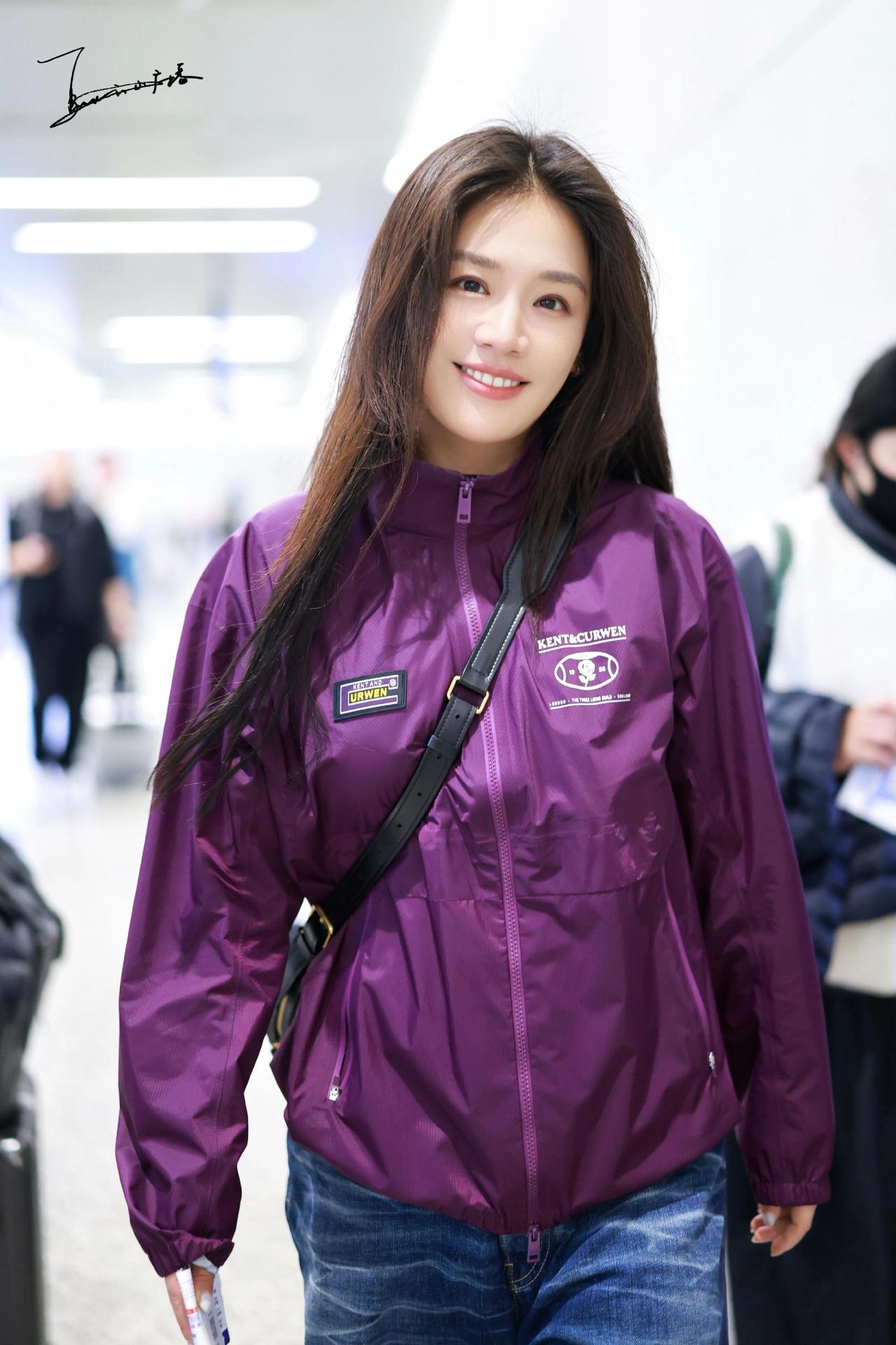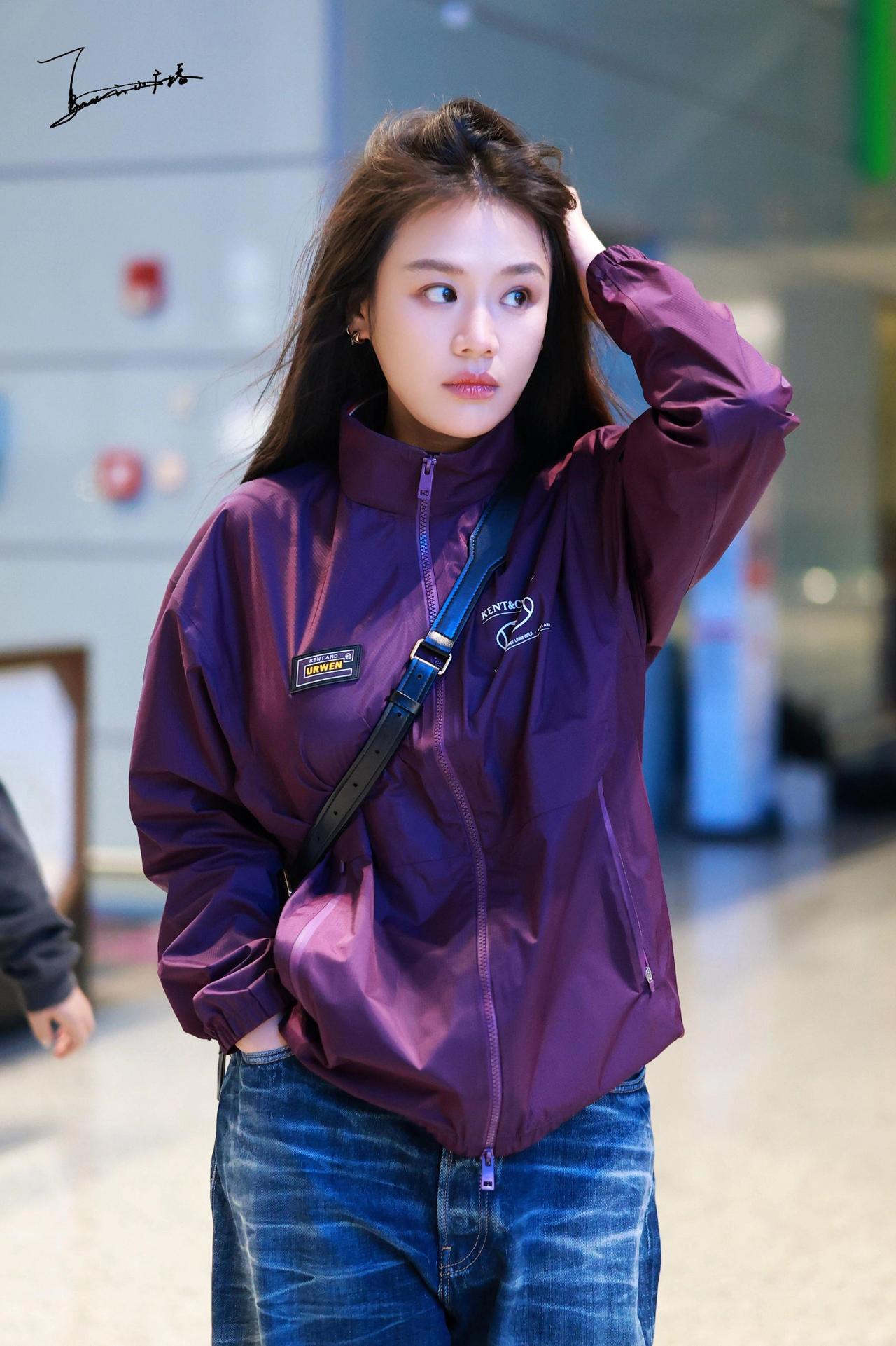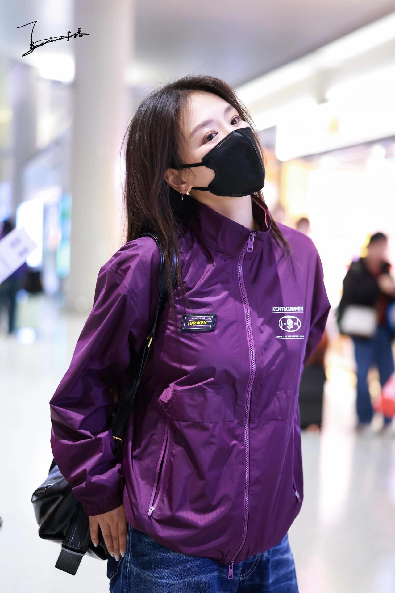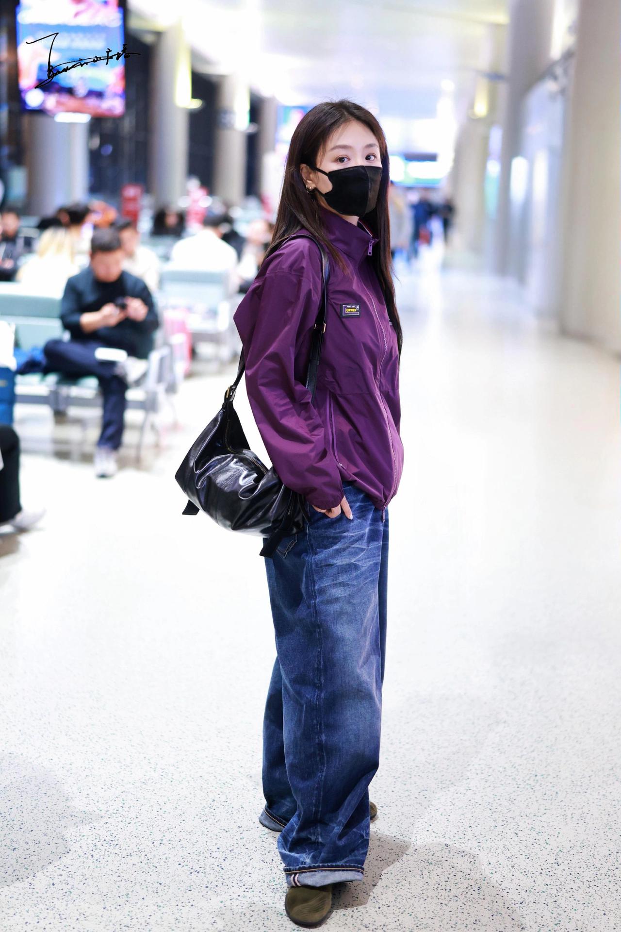马思纯这身机场造型太戳“随性元气感”了!深紫冲锋衣搭阔腿牛仔裤,配色亮眼却不浮夸