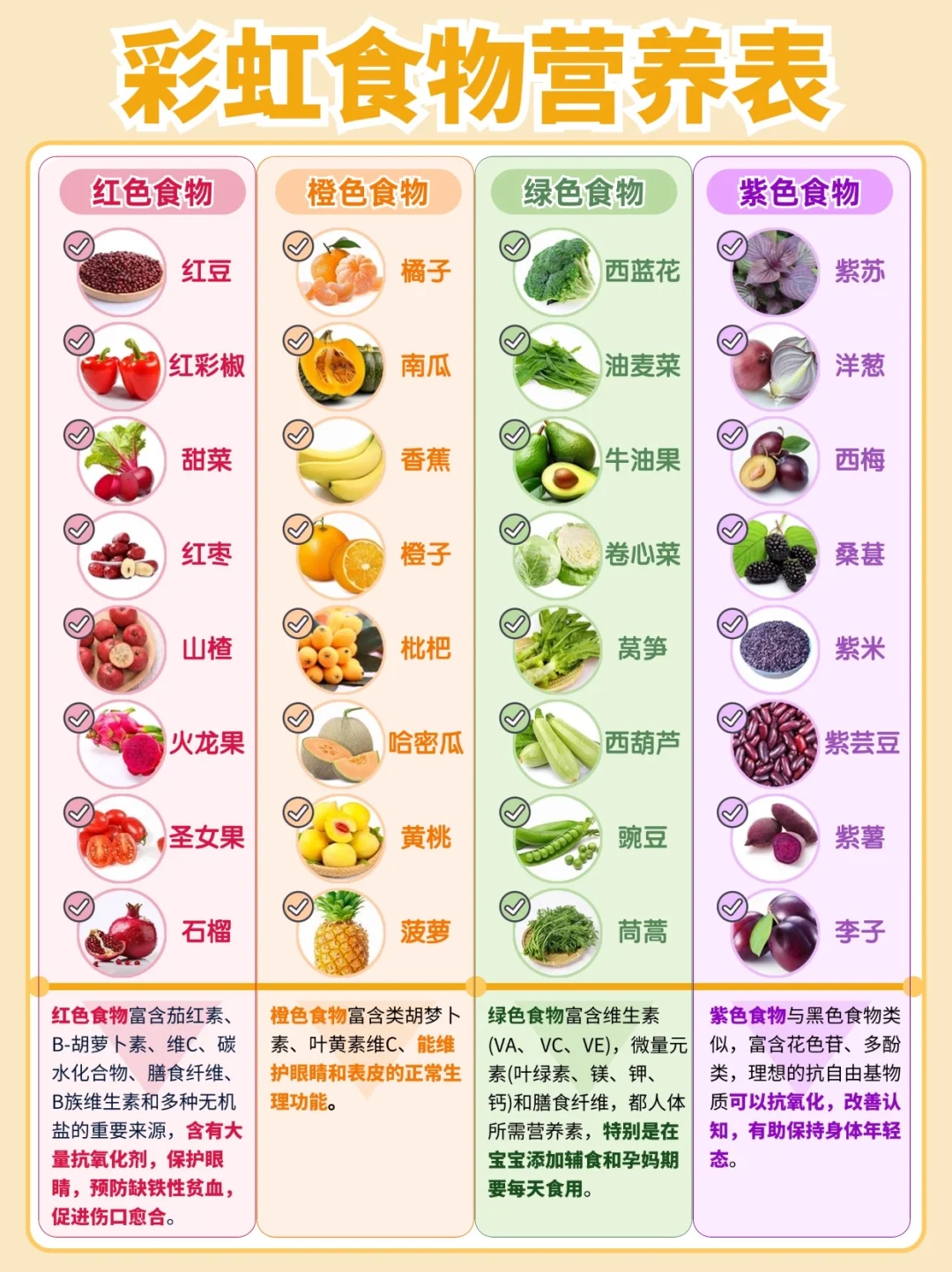 都说要让宝宝吃得有营养,但只会A炒B,B炒C,不会复杂工序的妈妈要咋办?最简单的“彩虹饮食法”就能解决,我在图2中码了各种颜色的实物代表,不同颜色代表不同的营养,有不同的作用,核心在于尽量搭配不同颜色的蔬菜,遇到宝宝不爱吃的蔬菜也只需要替换成同种颜色中宝宝爱吃的就好啦
