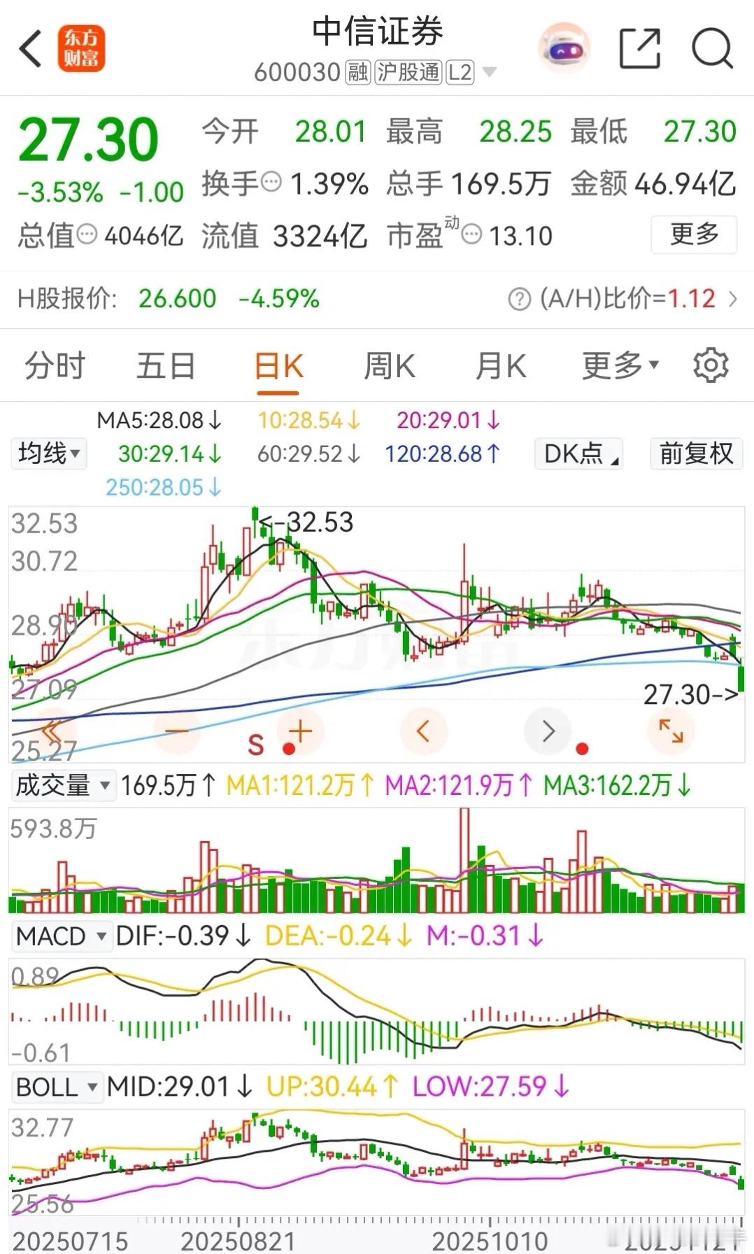 东方财富和中信证券今天双双大跌,东方财富更是连续六天下跌,连续六天被主力资金净卖出,而中信证券则是连续两天被主力资金抛售。东方财富今天早盘低开后直接杀跌,收盘时股价大跌了3.20%,收盘报价为23.30元。在资金流向上,连续六天被主力资金净卖出,今天的净卖出金额为 11.5483亿元,本周的累计净卖出金额为 26.0557亿元。从走势上看,日线级别连续六天下跌,已完全破位;周线走势则是连续四周下跌了,本周的跌幅为 5.05%,已经跌破了60周线。中信证券今天同样也是低开低走,大跌了3.53%,收盘报价27.30元,全天的成交金额为46.94亿元。在资金流向上,今天被主力资金大幅净卖出了约8.8778亿元,本周的合计净卖出金额为17.632亿元。从走势上看,中信证券的股价同样也是跌破了各条均线,处于完全破位之中;周线同样也是四连阴,目前已经跌破了60周线。至于更详细的分析,可以查看上一篇中关于券商概念板块走势的分析。对于二者后续走势,由于券商板块受政策调控影响显著,目前大家已经感受到了“慢牛”导向下的短期压盘行为,进而引发的惨烈调整。