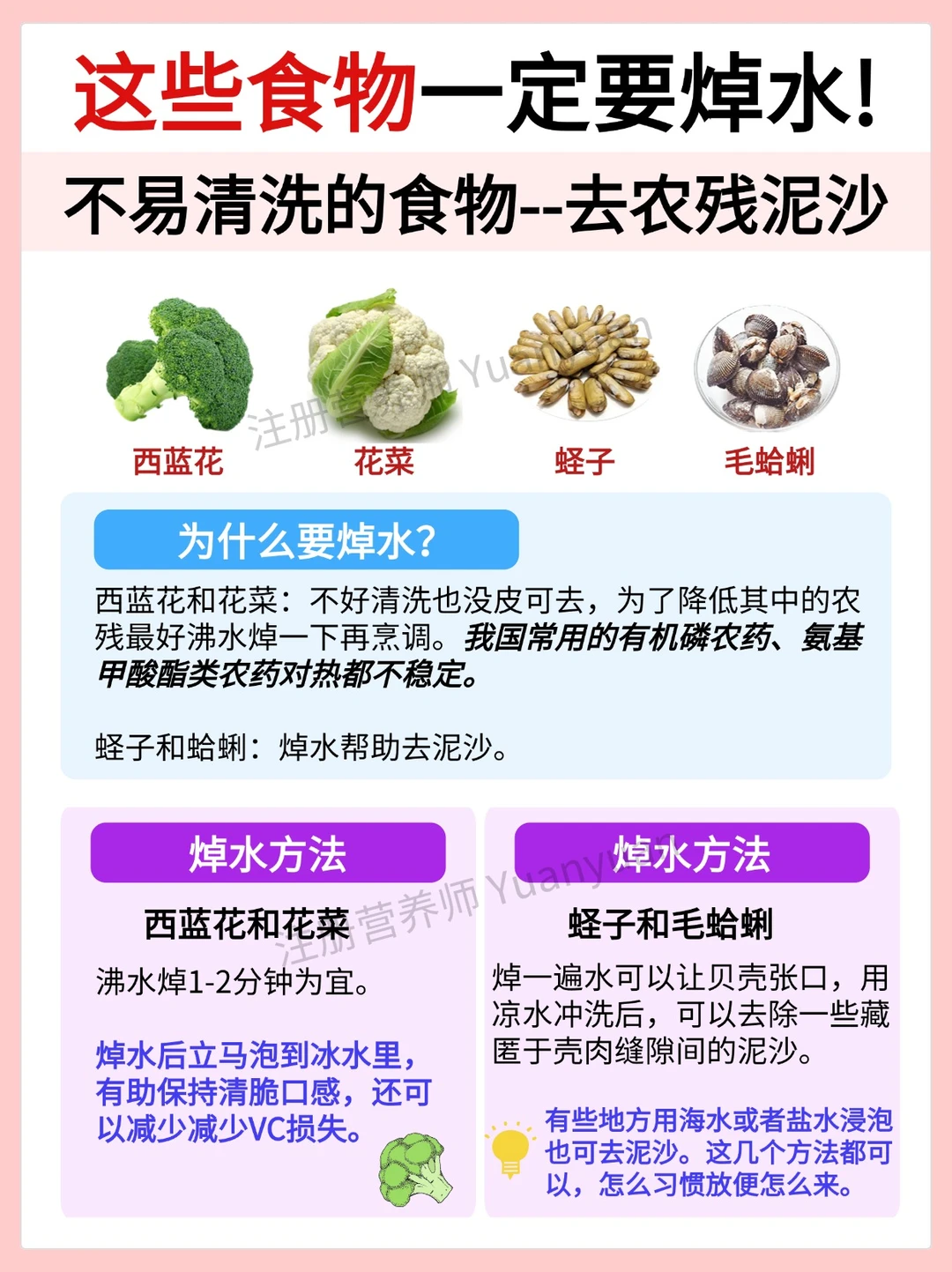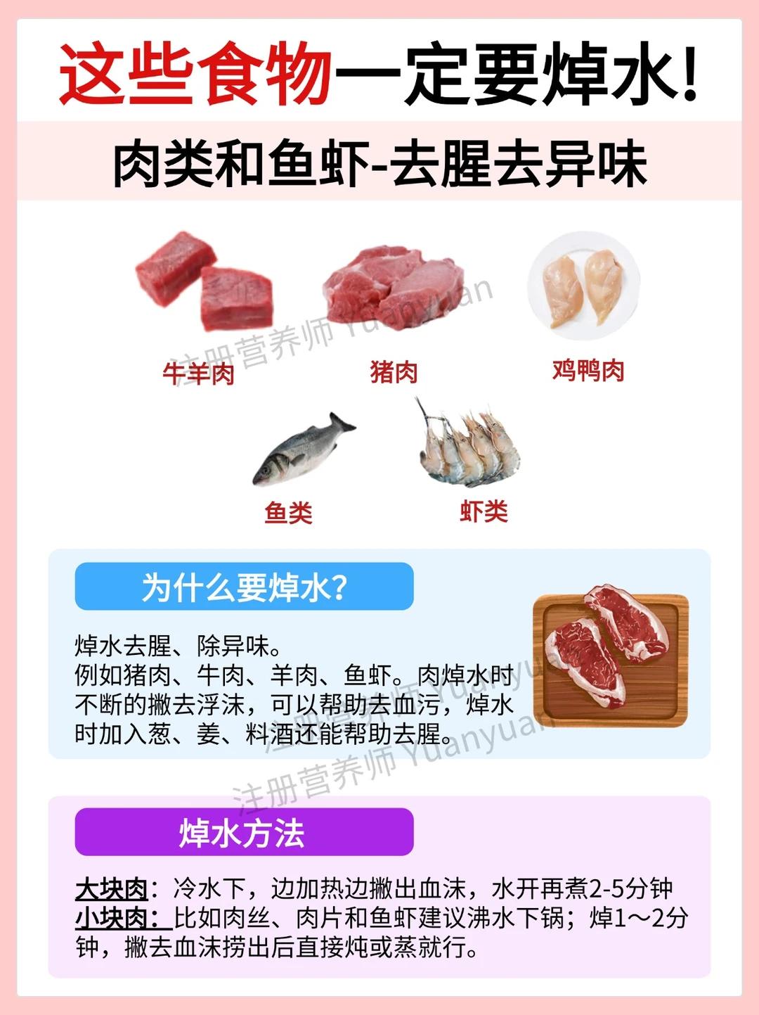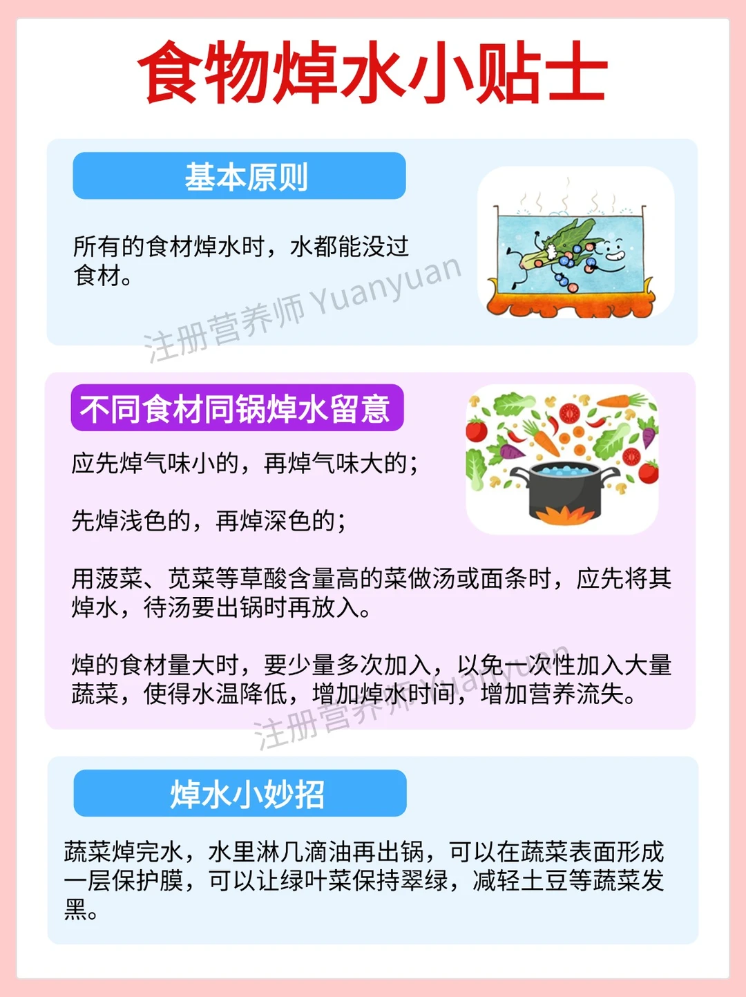 焯水:一道做饭时的常见工序 但你真会焯水吗? 哪些食材需要焯水? 需要冷水还是热水? 焯水做对了健康又保命! 做错了营养和口感都会大打折扣! 一起来盘点一下焯水技巧和方法👉🏻图2-6。 ⚠️需要额外注意 水量最好淹没食材,这样能保证加入食材后,锅里的水能在短时间内再次沸腾,缩短烹调时间,减少营养流失。