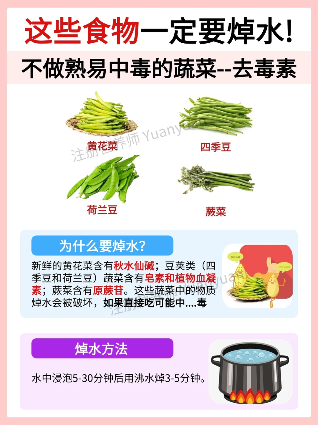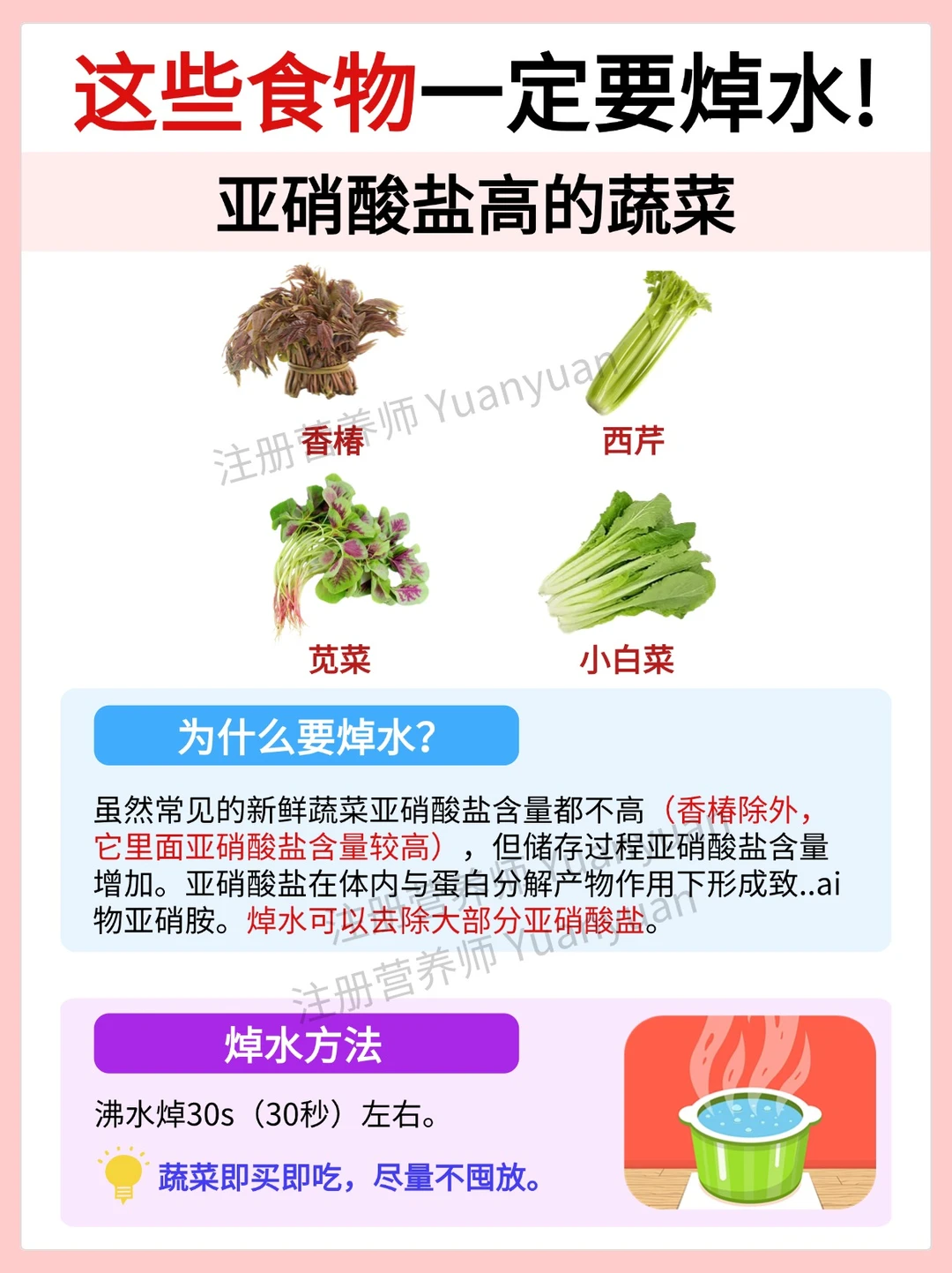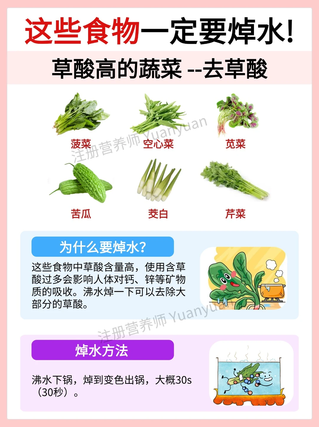焯水:一道做饭时的常见工序 但你真会焯水吗? 哪些食材需要焯水? 需要冷水还是热水? 焯水做对了健康又保命! 做错了营养和口感都会大打折扣! 一起来盘点一下焯水技巧和方法👉🏻图2-6。 ⚠️需要额外注意 水量最好淹没食材,这样能保证加入食材后,锅里的水能在短时间内再次沸腾,缩短烹调时间,减少营养流失。
