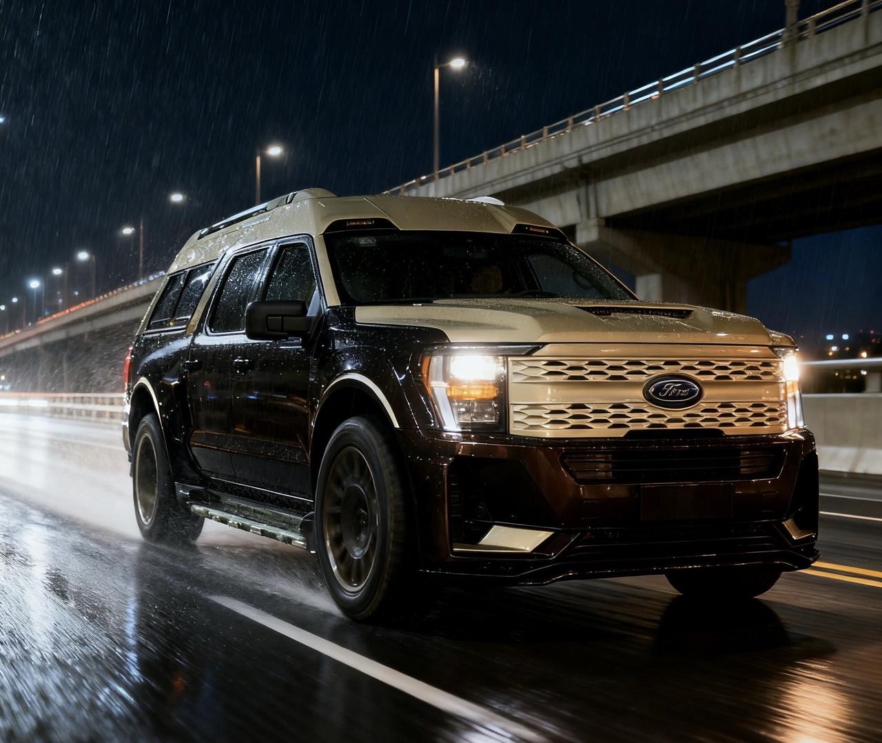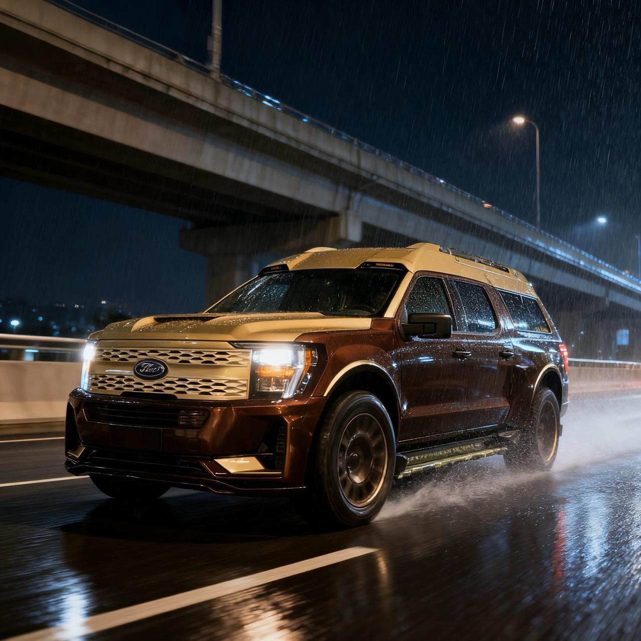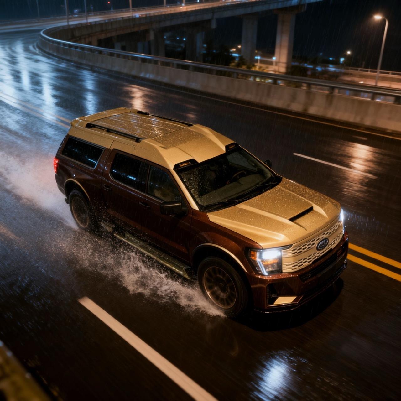 帮我生成图片:用24-40mmf/2,从前方45度角给我的车拍一张照片,让它看起来像在高架桥上行驶的精致画面,车轮转动状态,雨天夜晚,车身雨水往后漂,车灯打开。原比例。比例1:1福客特白泽 硬派越野 气场全开