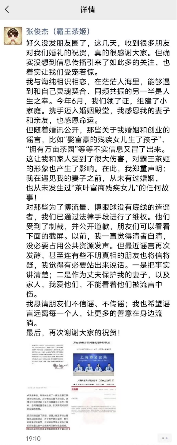 11月21日,张俊杰于朋友圈发文,证实了这一婚讯,并透露已于今年6月登记领证。在感谢公众祝福的同时,张俊杰也表示,此前围绕他婚姻和创业的诸多谣言,如“娶富豪的残疾女儿生了孩子”“拥有万亩茶园”等不实信息让其本人及家人受到了很大伤害。