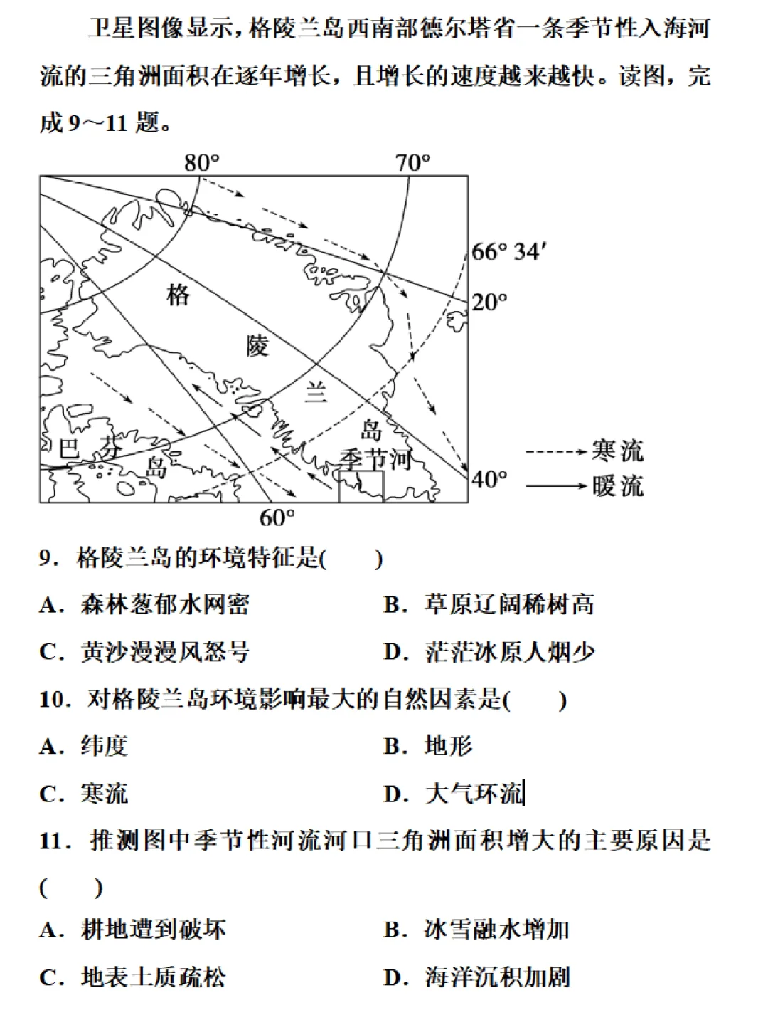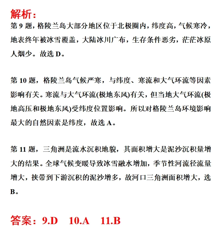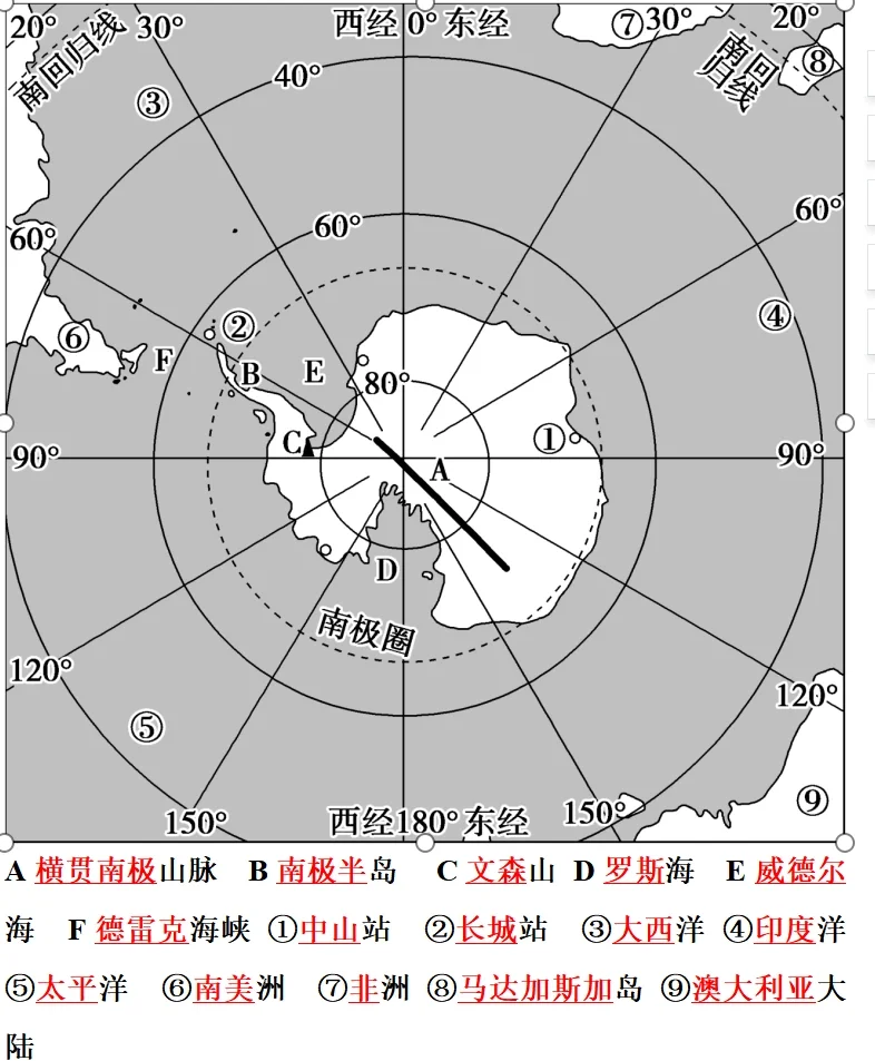 [一R]纬度高:南极洲地处高纬,加之地表冰雪覆盖,反射率大,一年之内地面接收太阳光热最少,造成严寒。