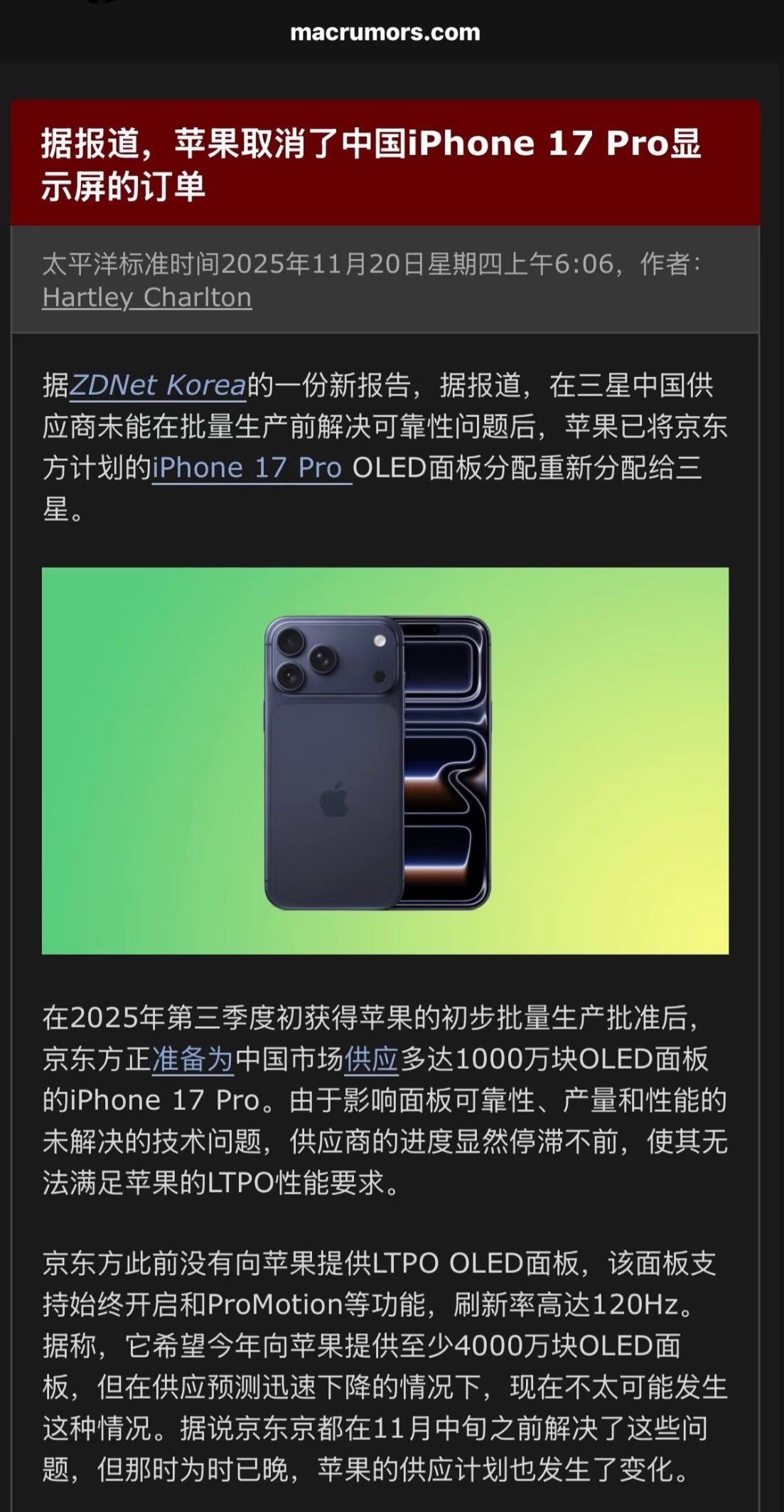 苹果取消国产iPhone17Pro显示屏订单据韩国媒体ZDNetKorea