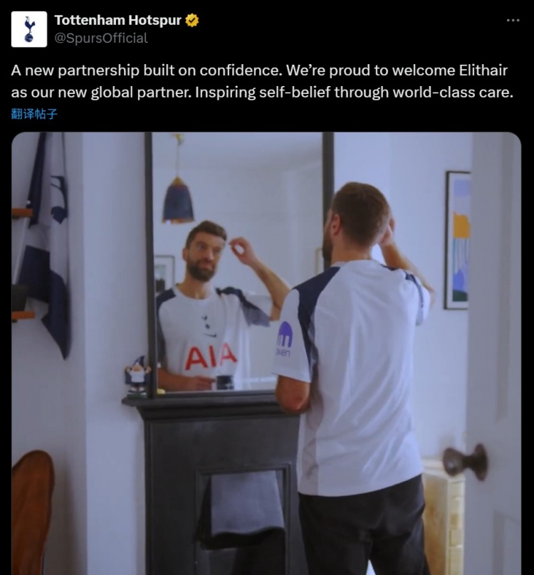 热刺官推表示:“一项建立在自信心基础上的全新合作关系。我们非常自豪地欢迎Elithair成为我们新的全球合作伙伴。通过世界一流的护理,激发人们的自信。”