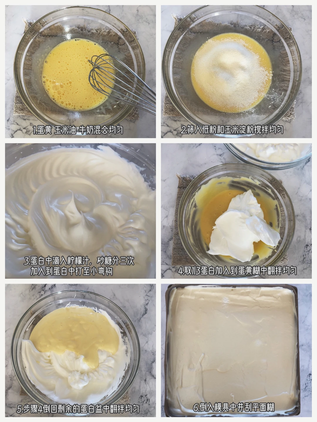 ❶分离蛋白和蛋黄。将蛋黄、玉米油、牛奶、搅打均匀。