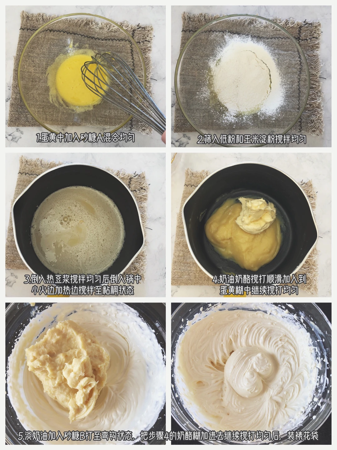 ❺淡奶油中加入细砂糖B打发至小弯钩状态,加入到步骤❹中搅打均匀,装入裱花袋。