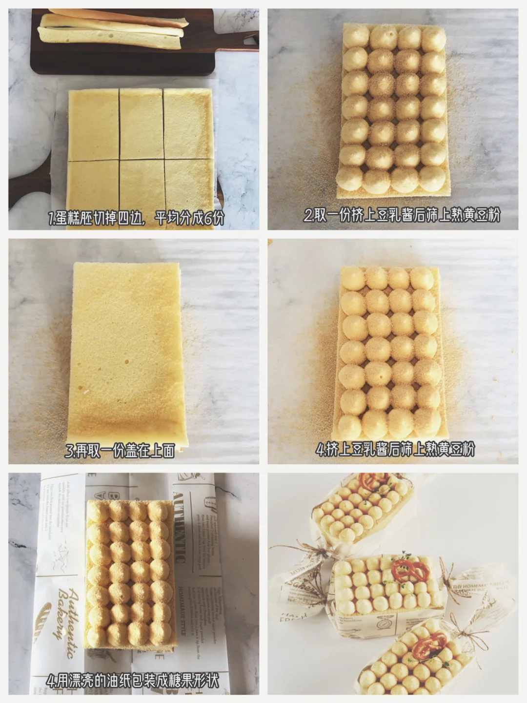 ❷取其中1份挤上豆乳卡仕达酱,筛上熟黄豆粉,再取1份蛋糕胚盖上去,继续挤上卡仕达酱,筛上熟黄豆粉,然后用好看的油纸包装成糖果形状就可以了。