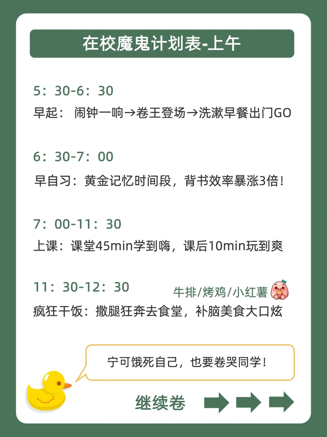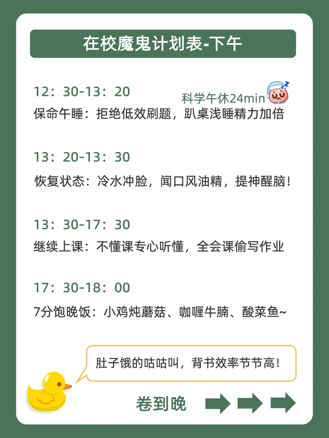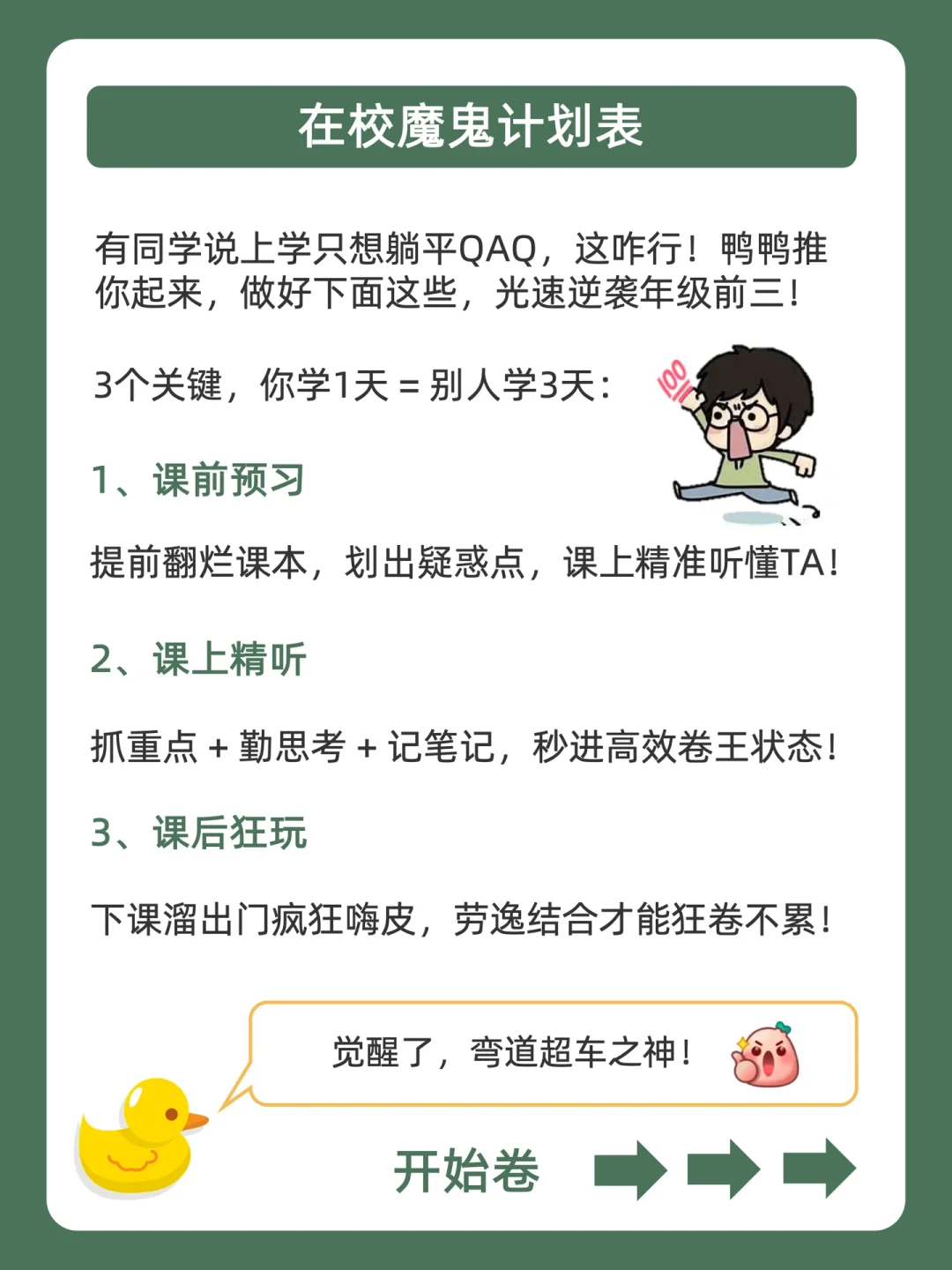 . [赞R]开学摆烂不用怕,鸭鸭带你做学霸❗ . [向右R]有同学说现在开学了,不知道怎么在学校高效内卷?[石化R] . [飞吻R]鸭鸭这么宠粉,肯定会全力以赴帮助你们的哇![赞R] . 今天就来分享,在校卷王计划表,都在上面的图,看完就会用!从此魔鬼内卷,逆袭学霸![赞R] . ️🐣我是鸭鸭,持续更新优质学习方法,陪宝子们逆袭学霸,驰骋学海!🌊