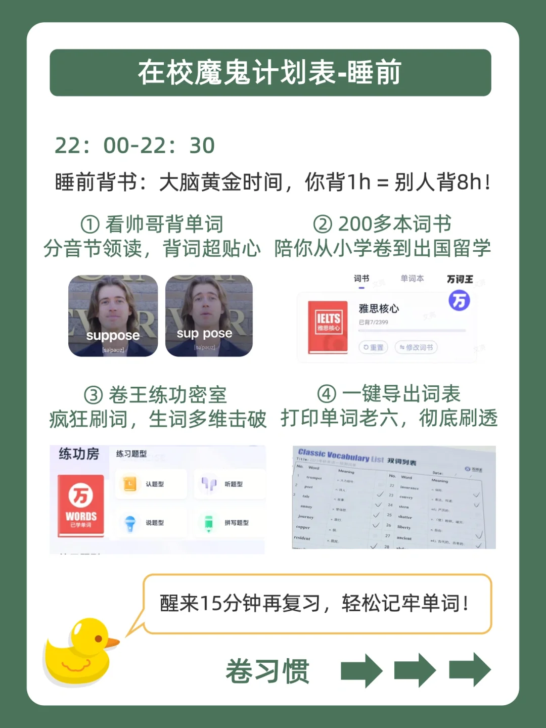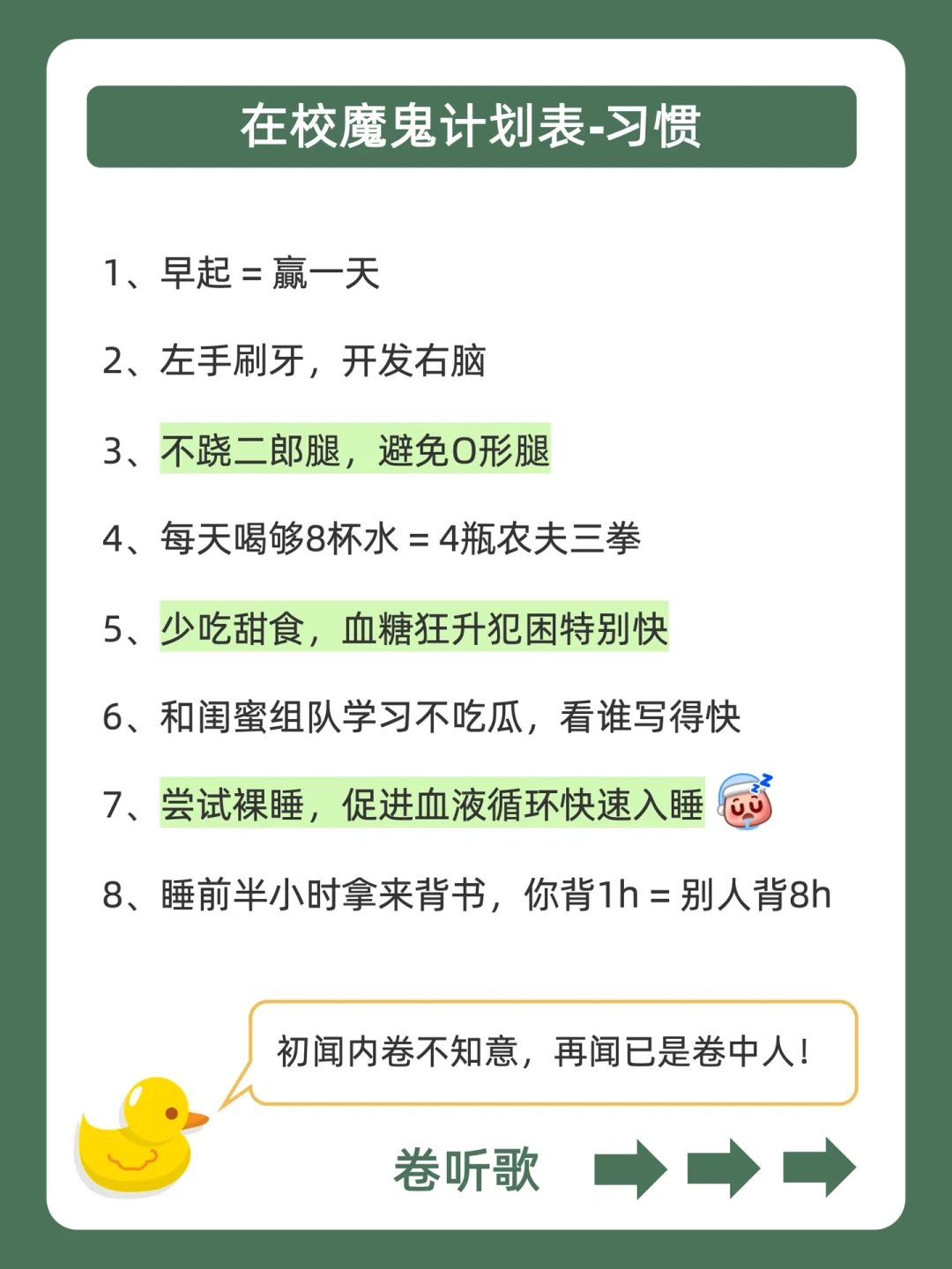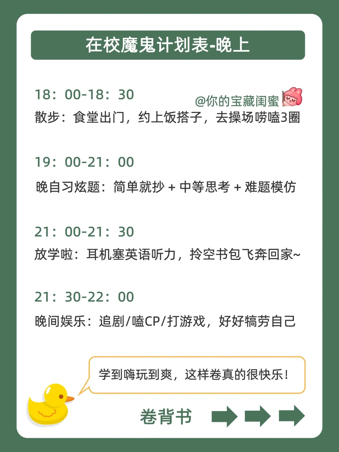 . [赞R]开学摆烂不用怕,鸭鸭带你做学霸❗ . [向右R]有同学说现在开学了,不知道怎么在学校高效内卷?[石化R] . [飞吻R]鸭鸭这么宠粉,肯定会全力以赴帮助你们的哇![赞R] . 今天就来分享,在校卷王计划表,都在上面的图,看完就会用!从此魔鬼内卷,逆袭学霸![赞R] . ️🐣我是鸭鸭,持续更新优质学习方法,陪宝子们逆袭学霸,驰骋学海!🌊