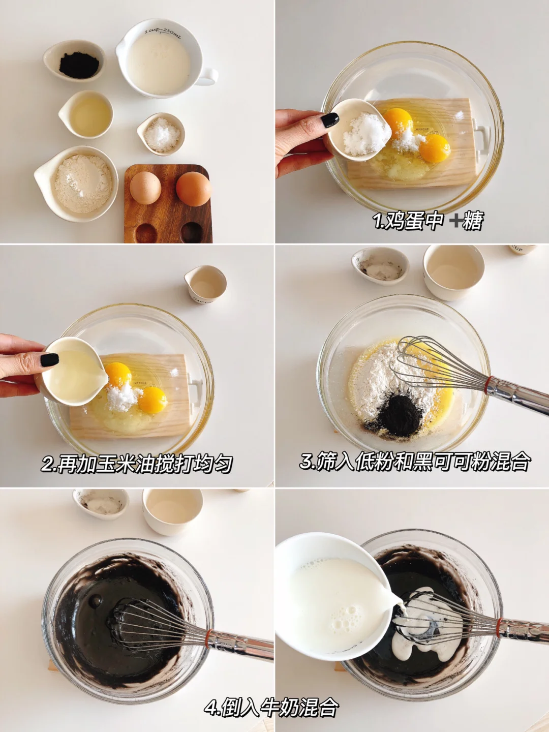 鸡蛋2个|玉米油20g|牛奶200g|糖15g|低粉50g|黑可可粉5g