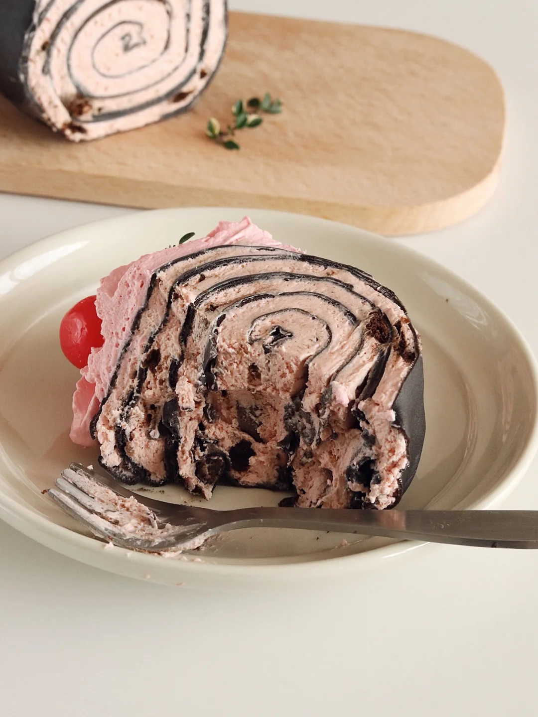 ❻将打发的奶油抹在饼皮上,两边叠进去然后卷起,包保鲜膜入冰箱冷藏1小时定型