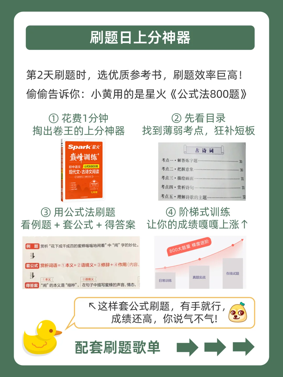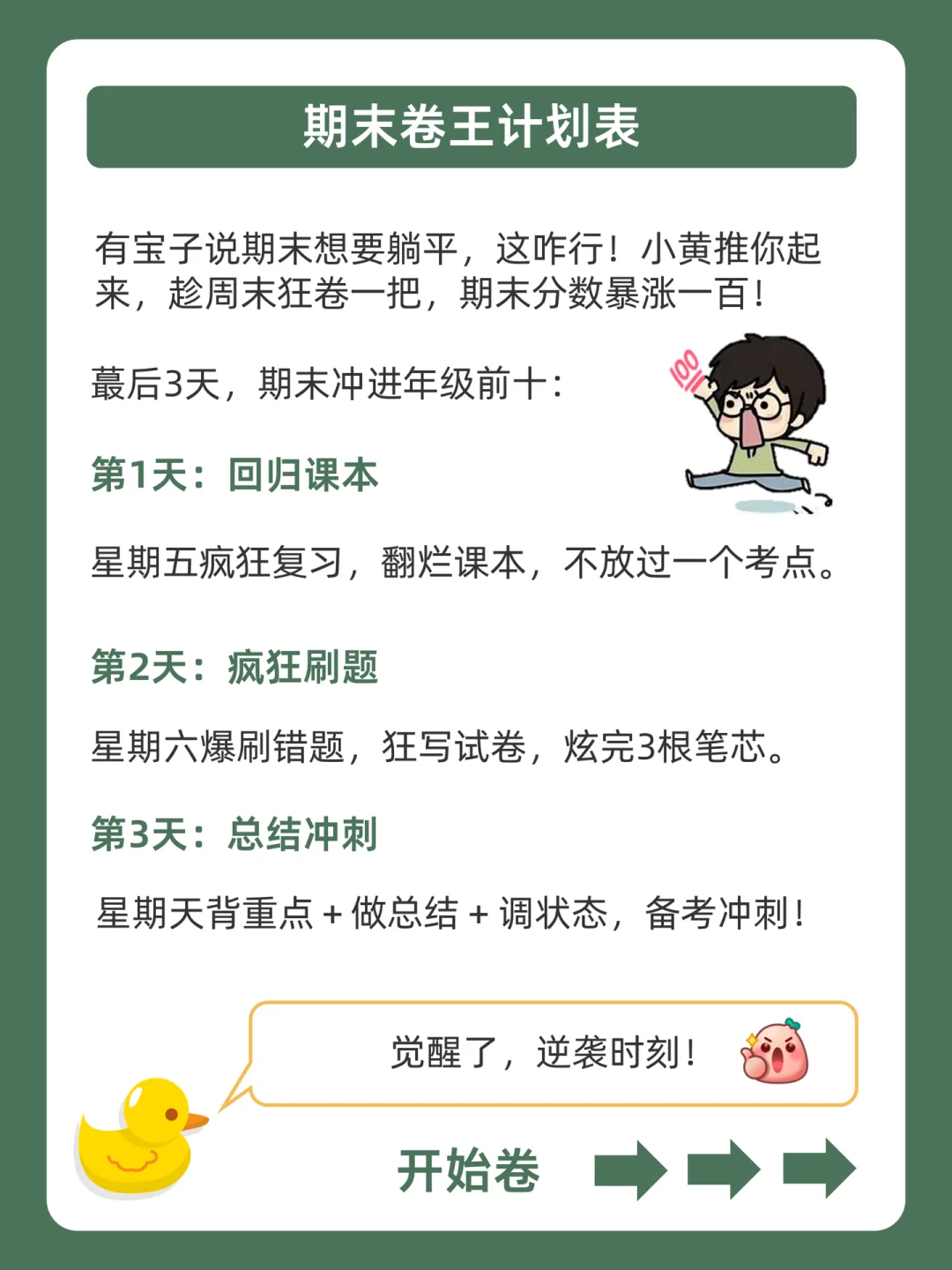 . [赞R]帮你逆袭学霸,是小黄的责任❗ . [向右R]好多同学说自己离期末考只剩3天了,不知道怎么高效复习?[石化R] . [飞吻R]小黄学长这么宠粉,肯定会全力以赴帮助你们的哇![哇R] [飞吻R] 配套星火的宝藏书籍《公式法800题》,分数上涨嘎嘎快↑[赞R] . 今天就来分享,期末魔鬼计划表,都在上面的图,看完就会用!从此期末翻盘,逆袭学霸。[赞R] . ️[太阳R]我是小黄,持续更新优质学习笔记,陪宝子们逆袭学霸,叱咤校园![赞R]