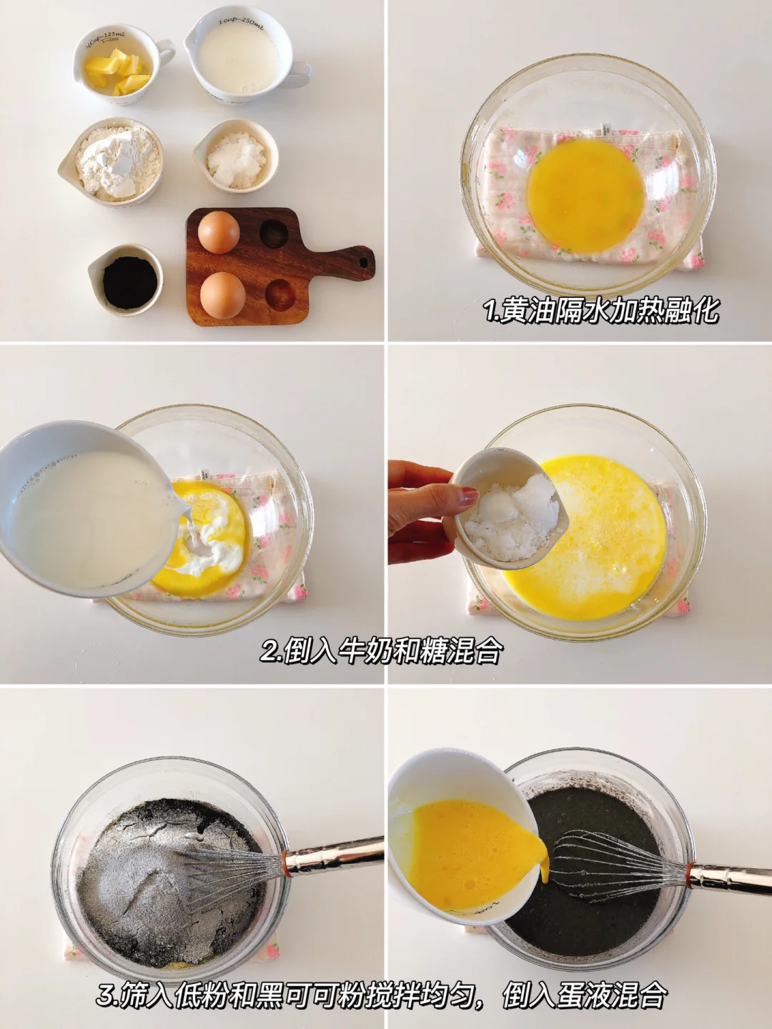鸡蛋2个|黄油25g|牛奶420g|糖40g|低粉120g|黑可可粉10g