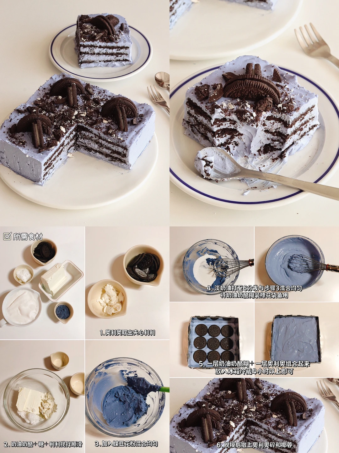 奶油奶酪190g|糖 40g|淡奶油380g|奥利奥3袋|蝶豆花粉6g