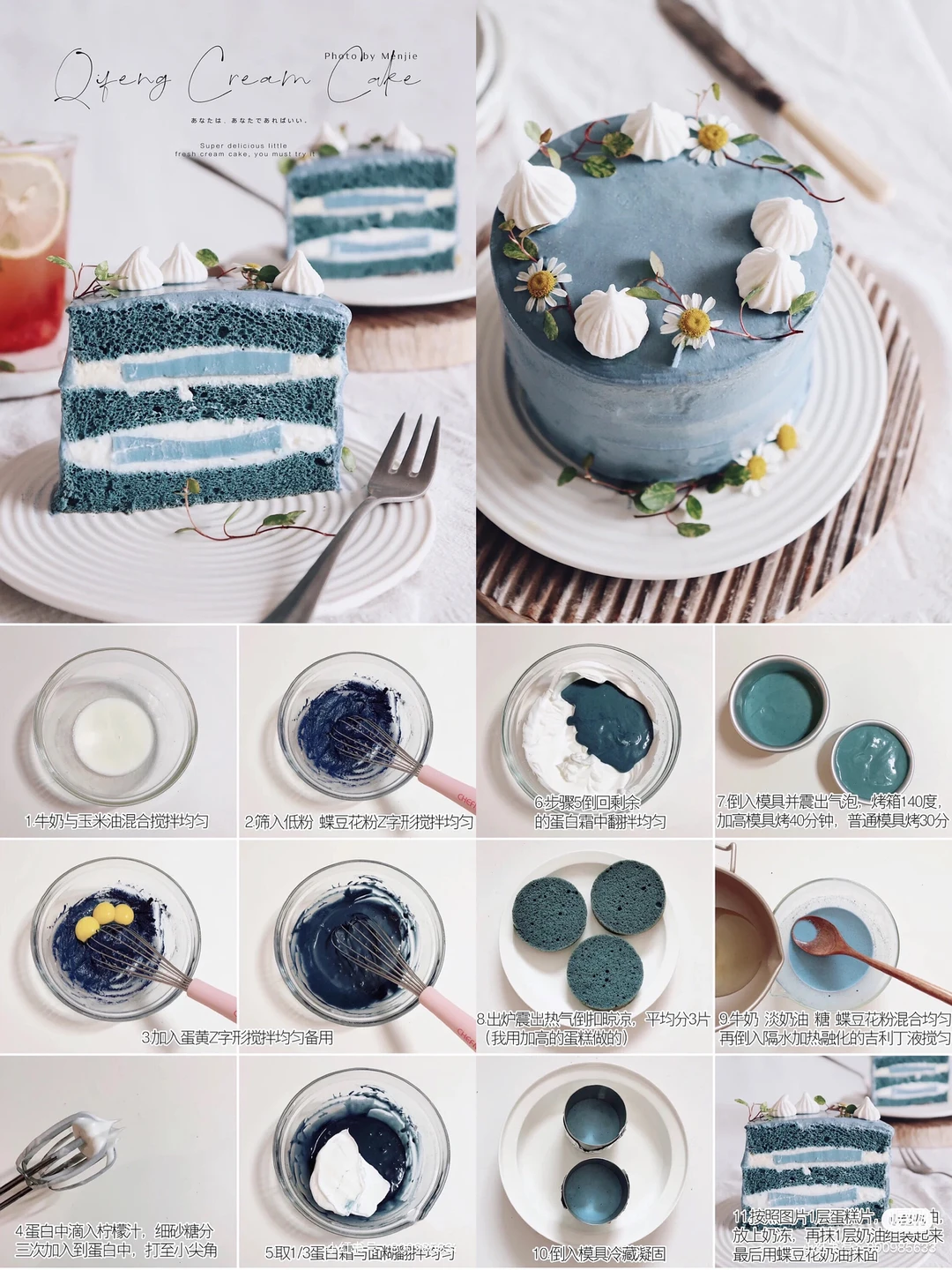 蛋糕胚:低筋面粉38g|蝶豆花粉7g|鸡蛋3个|牛奶45g|玉米油20g|细砂糖35g|柠檬汁少许