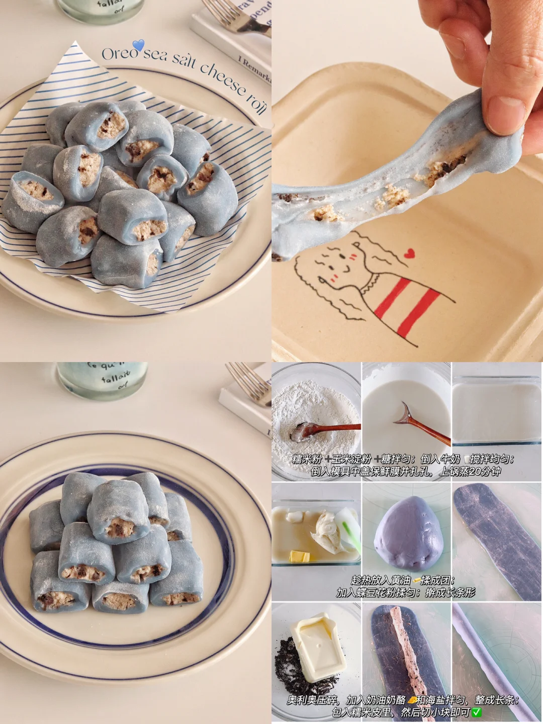 糯米粉160g|玉米淀粉20g|糖10g|黄油10g|牛奶190g|奥利奥3块|奶油奶酪250g|海盐0.5g|蝶豆花粉少许