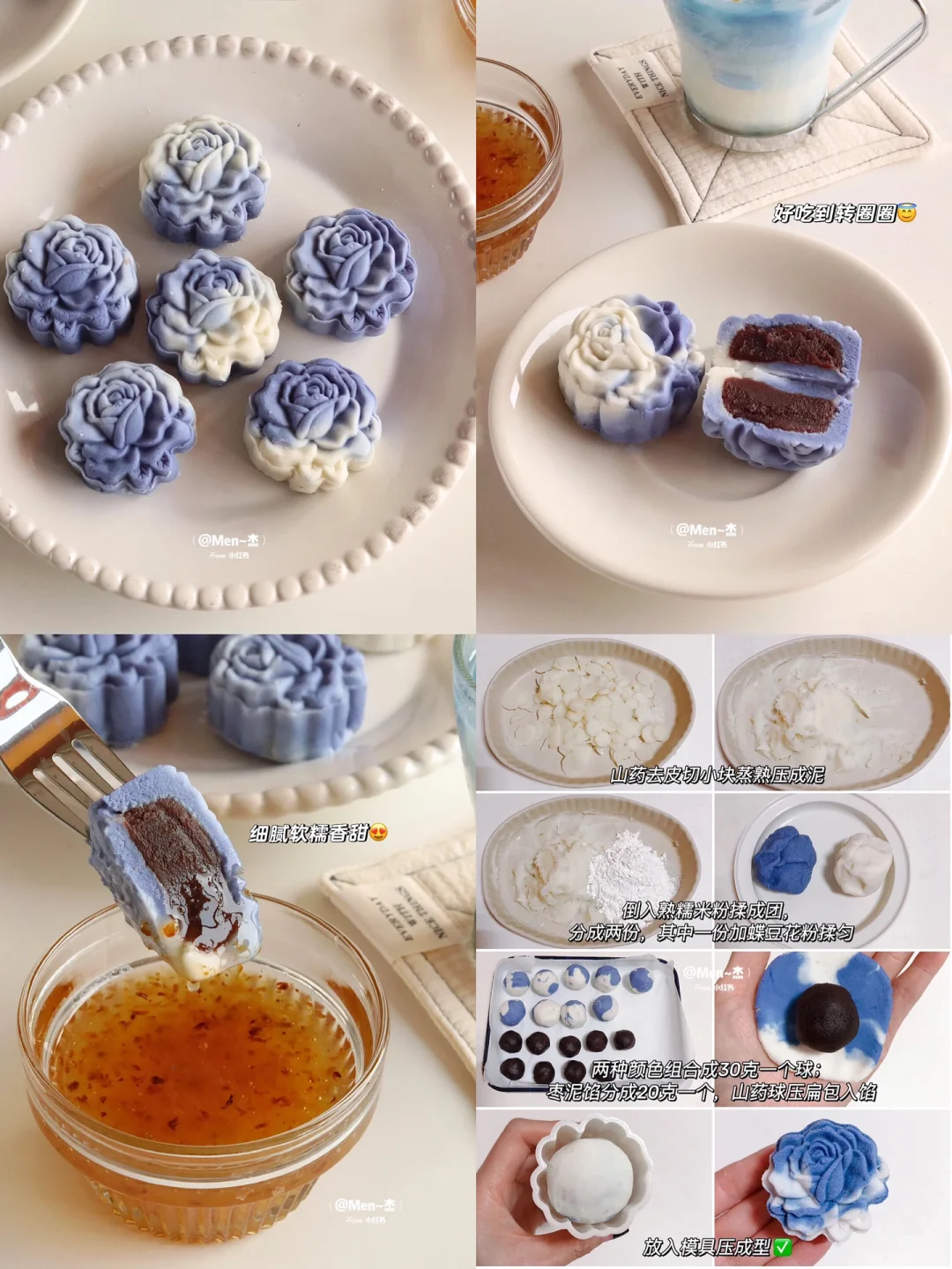 铁棍山药 300g|熟糯米粉 50g|蝶豆花粉 1.5g|枣泥馅 20g/个|桂花蜜🍯 少许