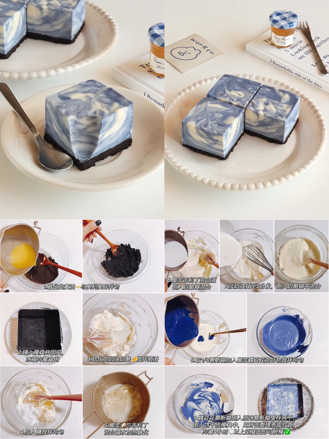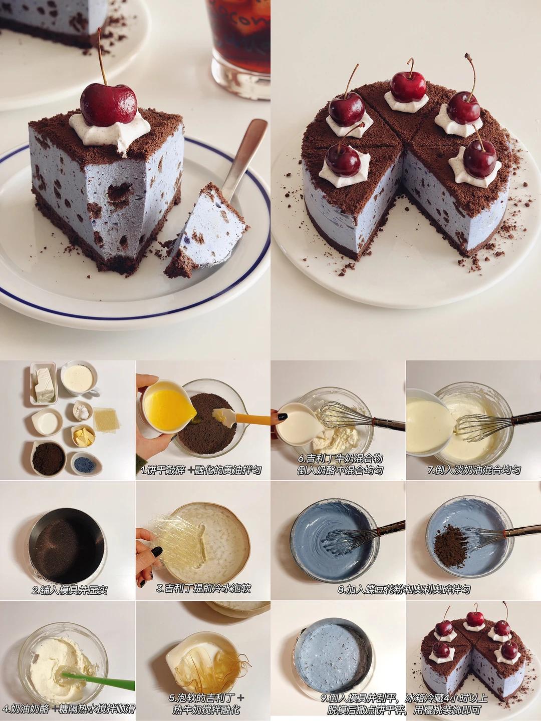 奥利奥碎60g|融化黄油30g|奶油奶酪200g|糖 40g|椰浆50g|吉利丁片8g|淡奶油100g|蝶豆花粉5g➕椰浆30g混合