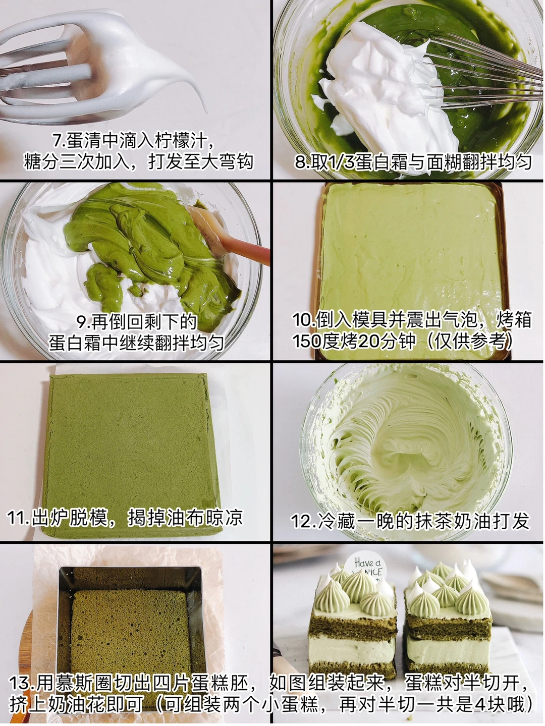 5️⃣将冷藏1晚的抹茶奶油打发;用慕斯圈(10.8X10.8X7)切出四片蛋糕胚;如图组装起来,上面挤奶油花