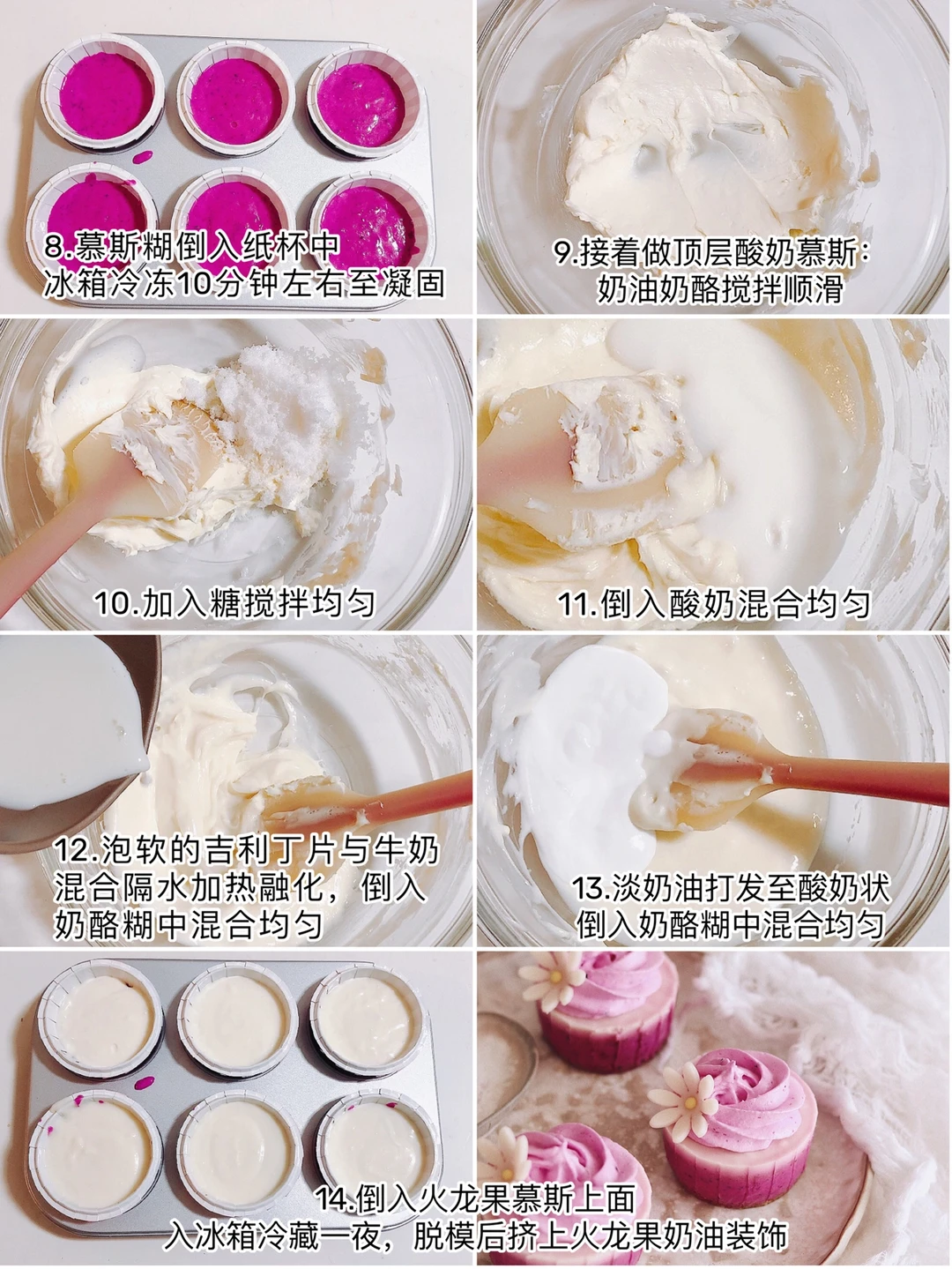 ❼接着做顶层酸奶慕斯:做法与步骤2~4相同,做好的酸奶慕斯糊倒在凝固好的火龙果慕斯上面,冷藏1晚或者4小时以上,脱模后挤上火龙果奶油(淡奶油90g+适量火龙果汁打发)