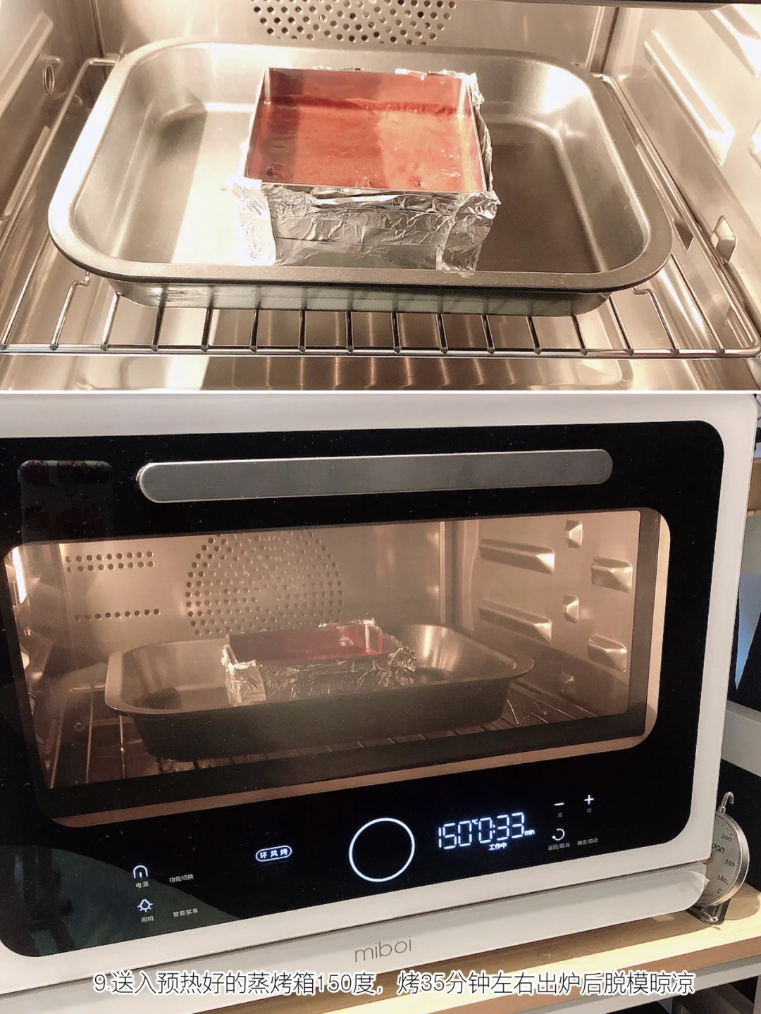 ❹慕斯圈底部用锡纸封住,将布朗尼糊倒入模具。送入预热好的米博蒸烤箱150度,烤35分钟左右。这个蒸烤箱有自动清洁功能,简直就是懒人的福音。出炉后脱模晾凉。