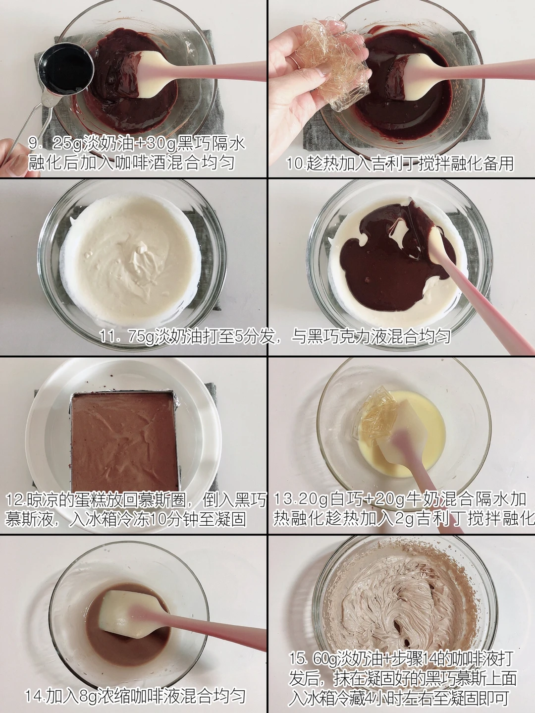 ❼咖啡慕斯:白巧+牛奶混合隔水加热融化,趁热加入吉利丁搅拌融化,倒入浓缩咖啡液混合均匀备用。淡奶油打至6分发,加入之前调好的咖啡液混合物,继续打至不流动状。将蛋糕脱模后抹在凝固好的黑巧慕斯上,入冰箱冷藏4小时左右至凝固,筛入一层可可粉即可。