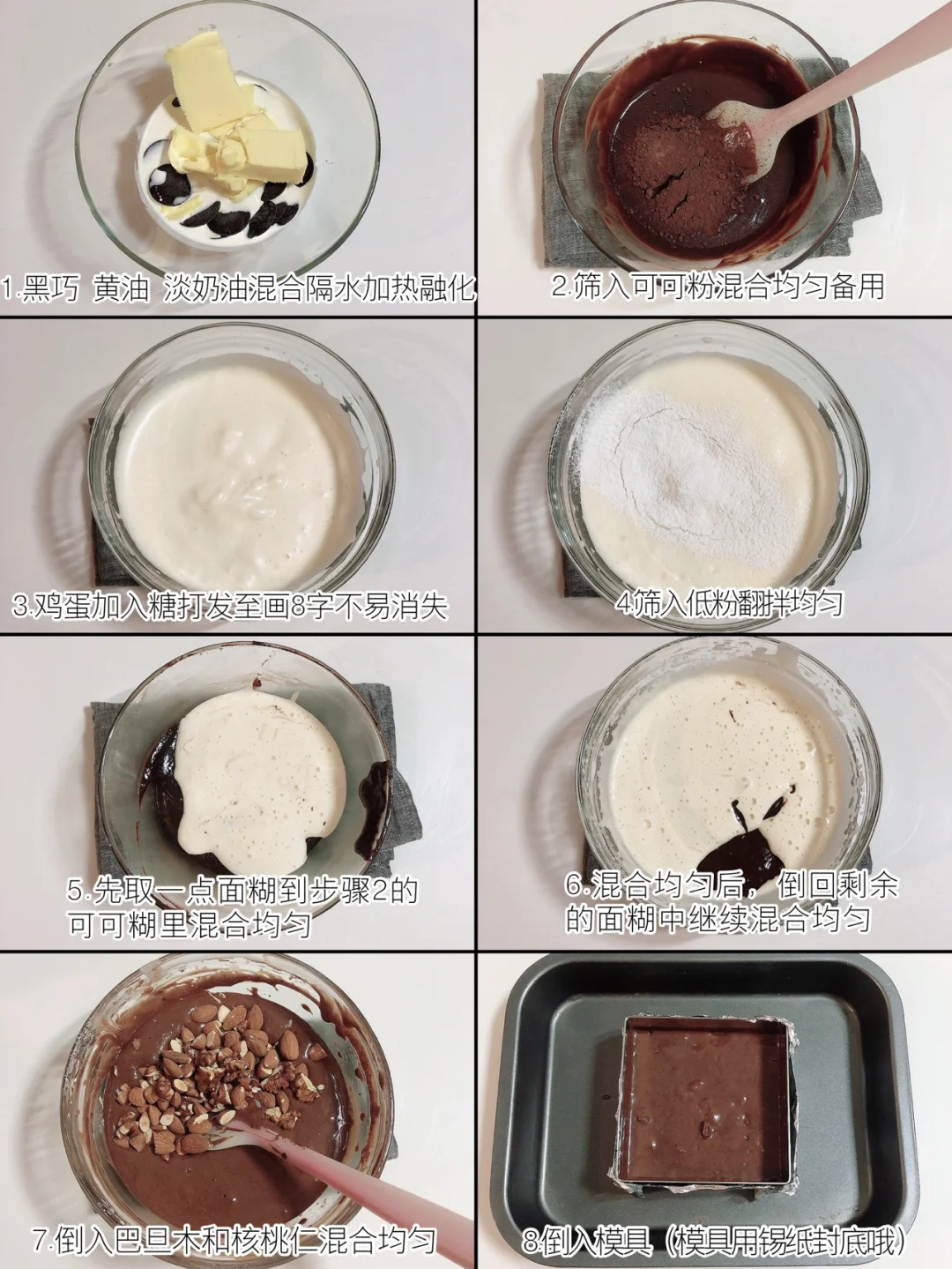 ❶坚果布朗尼:淡奶油、黑巧克力、黄油混合隔水加热融化,筛入可可粉搅拌均匀。