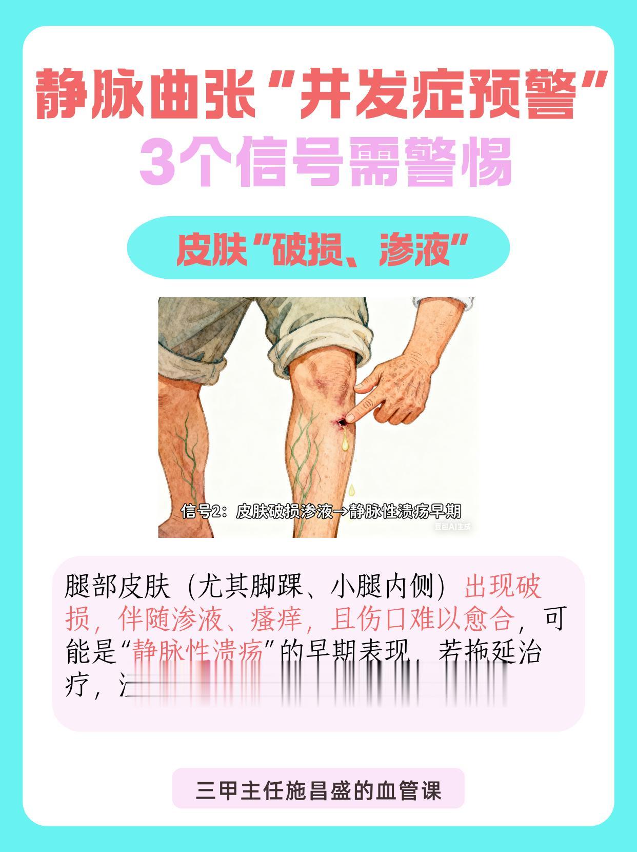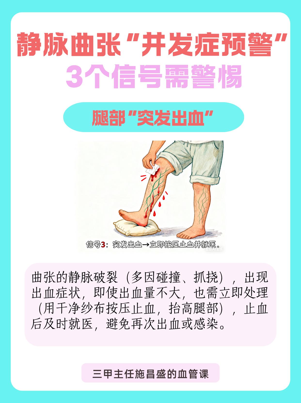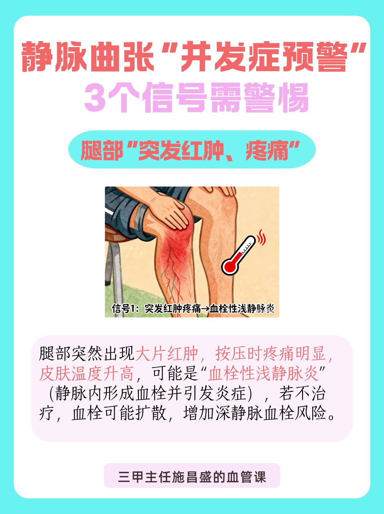 静脉曲张出现3个信号,立即就医。静脉曲张若不及时干预,可能引发严重并发症,出现以下信号需立即就诊