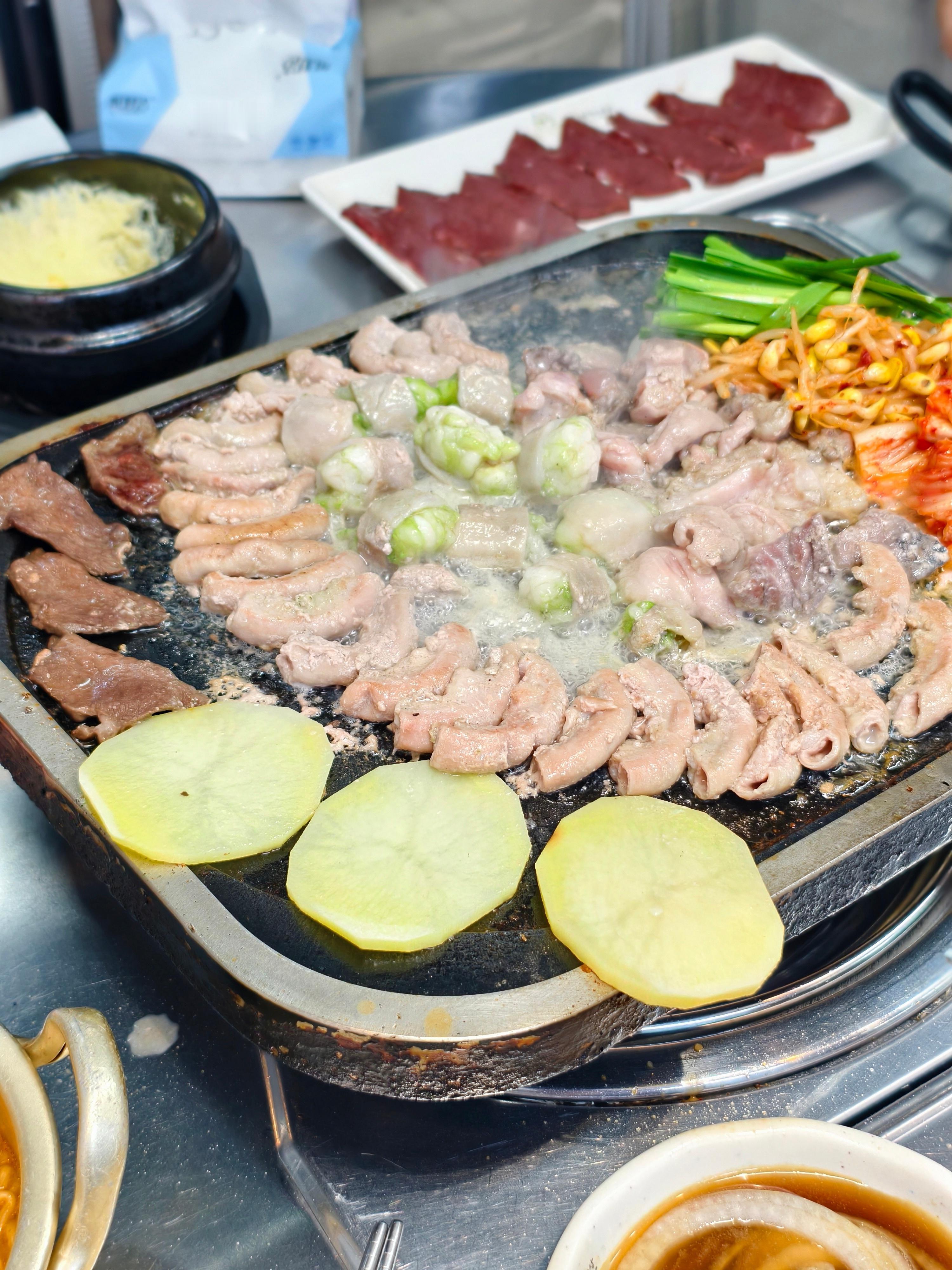 吃个特色菜,黄牛肥肠,老板说是延边特色菜。都是各种牛下货,有大肠、小肠、牛肝,牛
