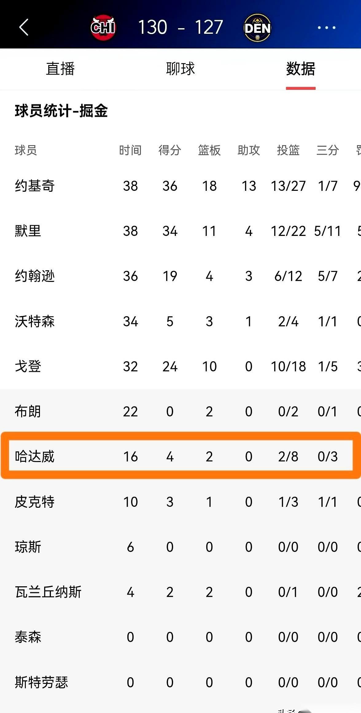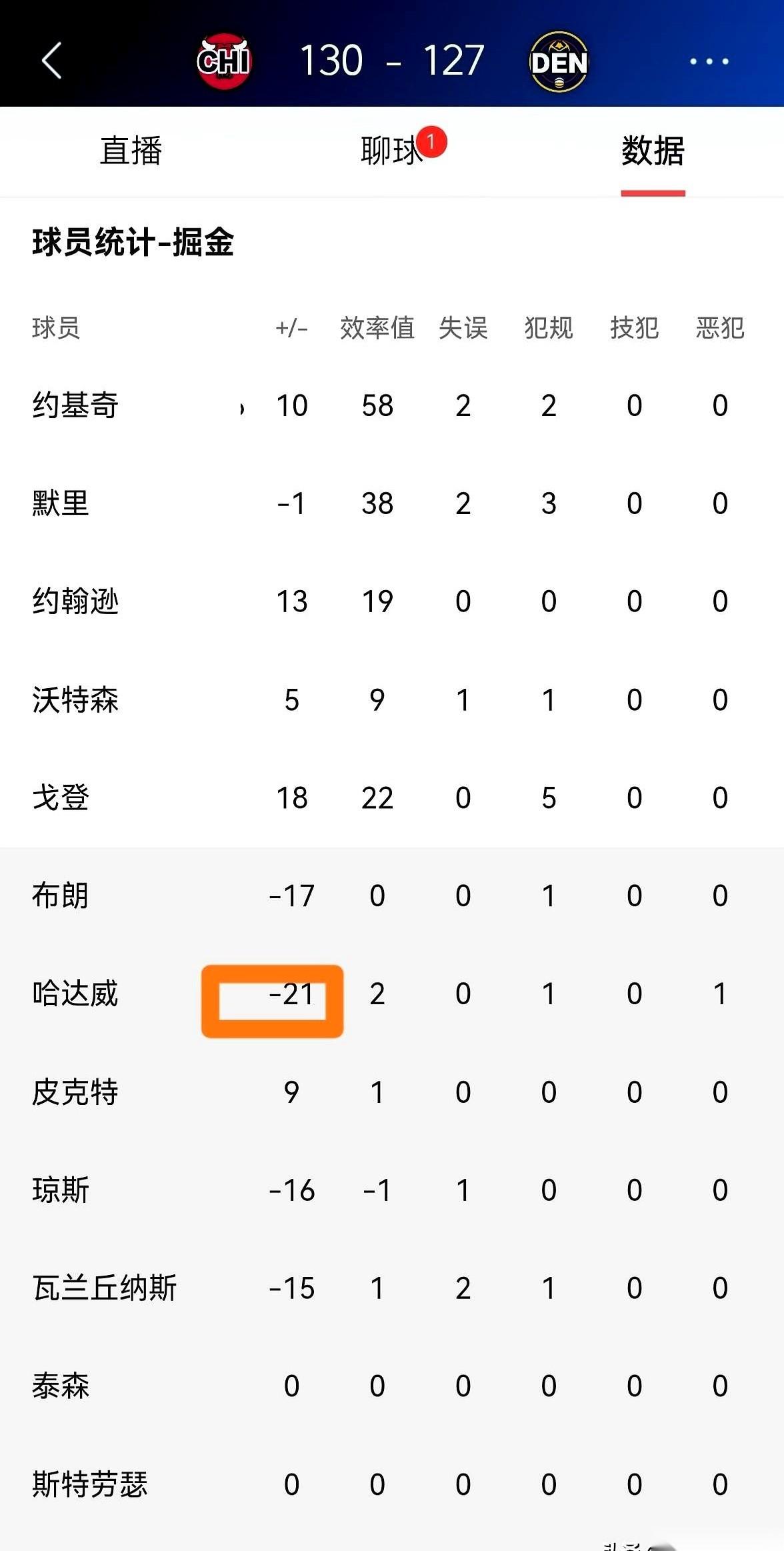 我给你讲个恐怖故事。 一个人,上场打了16分钟,他在场上的这段时间,球队净输21分。 恐怖吗?更恐怖的在后面。 最后全队就输了3分。 3分啊! 就差那么一口气,硬是没上来。你再回头看看那个-21,是不是血压一下就上来了? 没错,这“大神”就是小哈达威。 全场出手8次,扔进去2个。 拿了4分。 就4分。 我真的百思不得其解,你上去是干嘛的?散步吗?体验生活? 人家是第六人,你这是“第六个对手”啊,直接把自家板凳席打穿了。 有时候看球真的不是看输赢,是看一种心气儿。 你手感不好,可以,谁都有打铁的时候。但你不能在场上跟个梦游的黑洞一样,把全队的努力和心气儿都吸进去。 真的,没眼看。 看完气得肝疼,得喝口水缓缓。