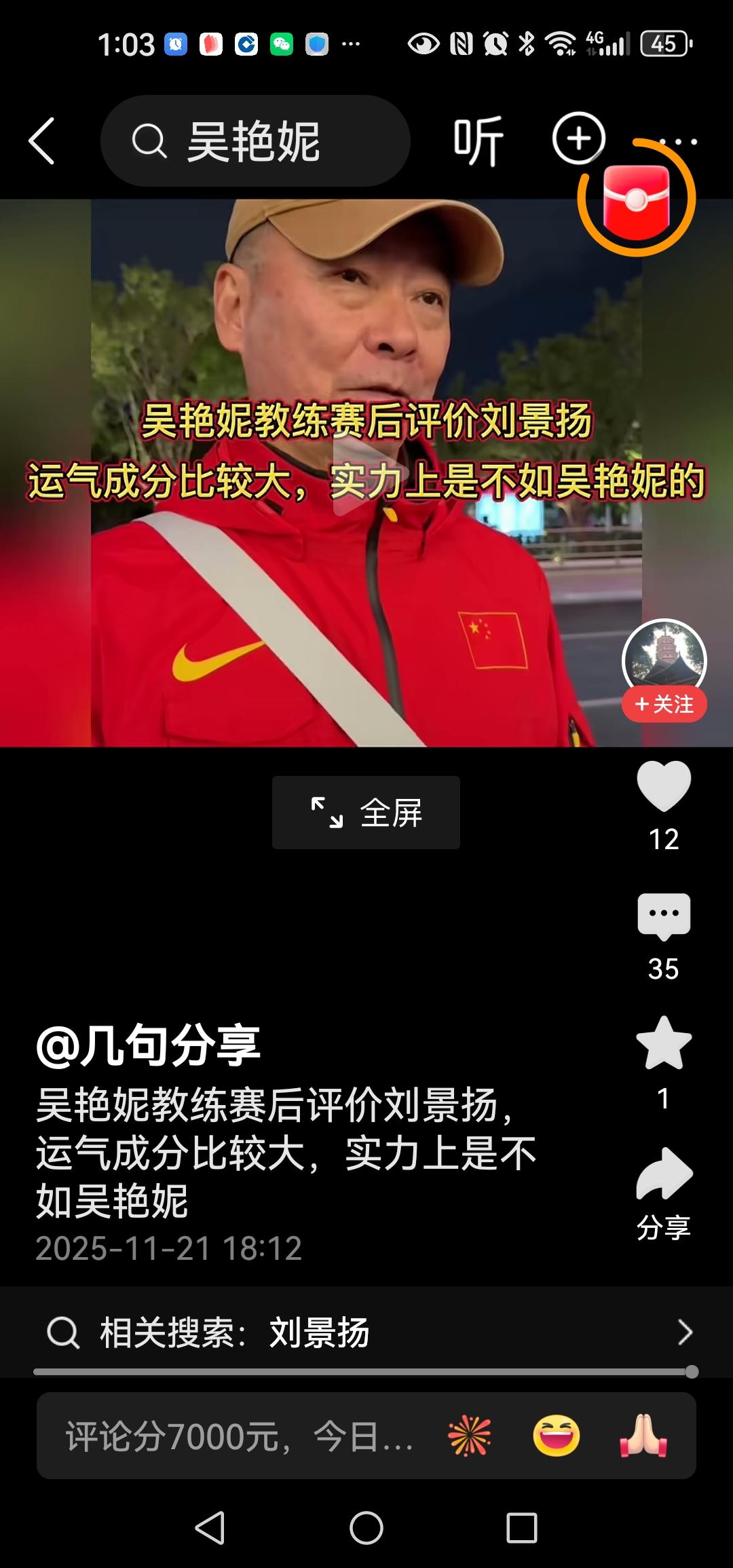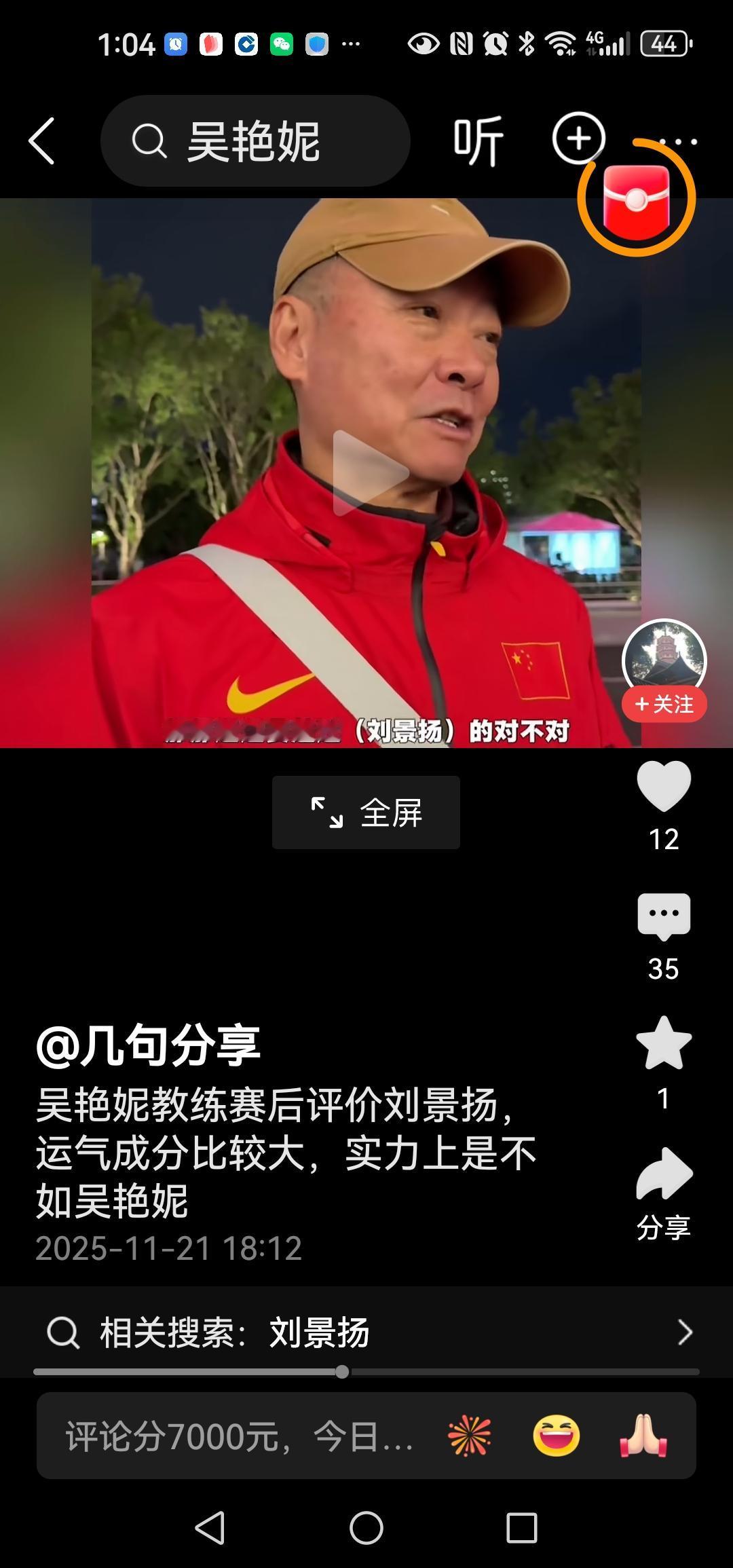 吴艳妮教练赛后评价刘景扬 运气成分比较大,实力上是不如吴艳妮的 成王败寇,输了就输了,别说什么人家运气好,实力不如吴艳妮之类的话,教练你知道明白就好了,但真不必说出来,你一说出来就不对了。 冠军已被刘景杨拿走了,你.私下对徒弟这样说没问题,是一种鼓励一种安慰,你对着广大观众们说人家是靠运气得来的冠军,就很不好了,很不得体了,不尊重人了,不尊重这运动了。 人家也是数十年如一日的挥汗如雨的在艰苦训炼,都是拼命的努力,不要否定别人的付出。 赢就是赢了,徒儿不服气,教练不服气,这就很不好了,有点赢得起输不起的感觉。 可以大度点,祝贺人家夺冠,下次再决雌雄。