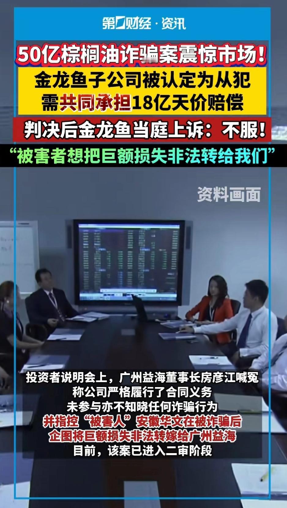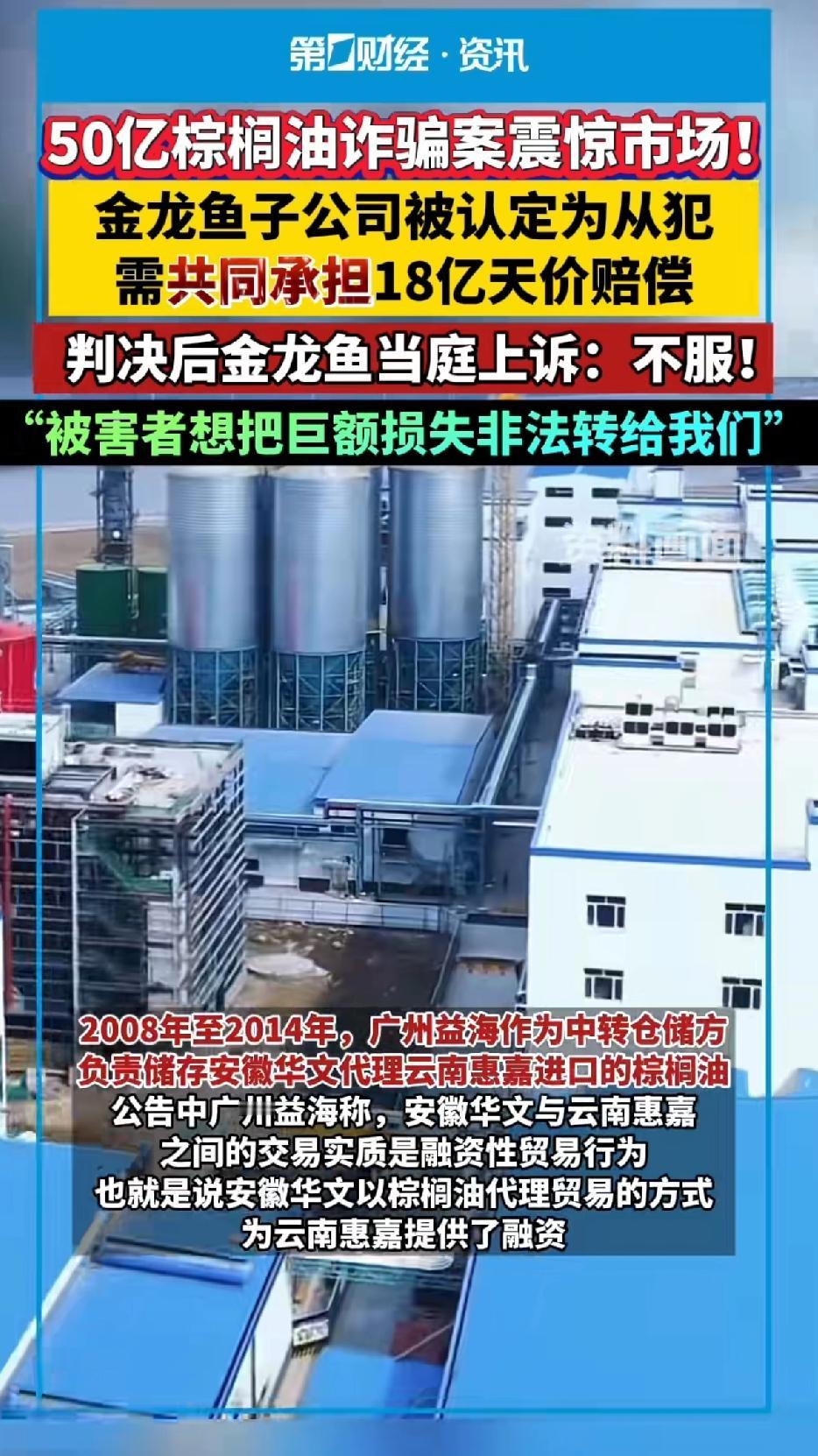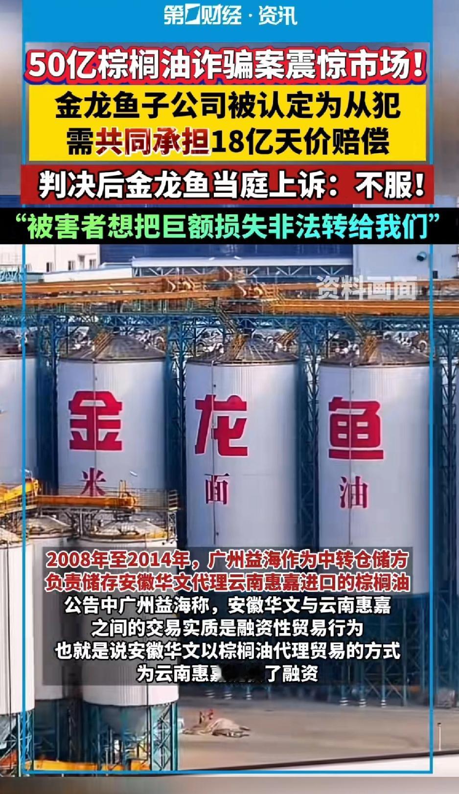 50亿棕榈油诈骗案震惊市场!金龙鱼子公司被认定为从犯,需要共同承担18亿天价赔偿。 金龙鱼子公司广州益海被认定为从犯,要和云南惠嘉共同承担18.81亿天价赔偿,这相当于金龙鱼去年净利润七成以上。 这案子可追溯到2008 - 2014年,广州益海作为中转仓储方,被控“配合”云南惠嘉诈骗,让安徽华文损失惨重。原广州益海总经理柳某某还因涉及此案获刑19年。 判决后金龙鱼不服,并当庭上诉。“被害者想把巨额损失非法转给我们” 11月21日金龙鱼开投资者说明会,明确不认可判决,子公司已上诉。目前案件在上诉期,一审未生效,对业绩影响不确定。 这案子也暴露了融资性贸易风险,三方把普通业务搞成高风险融资链,致国资损失超50亿。