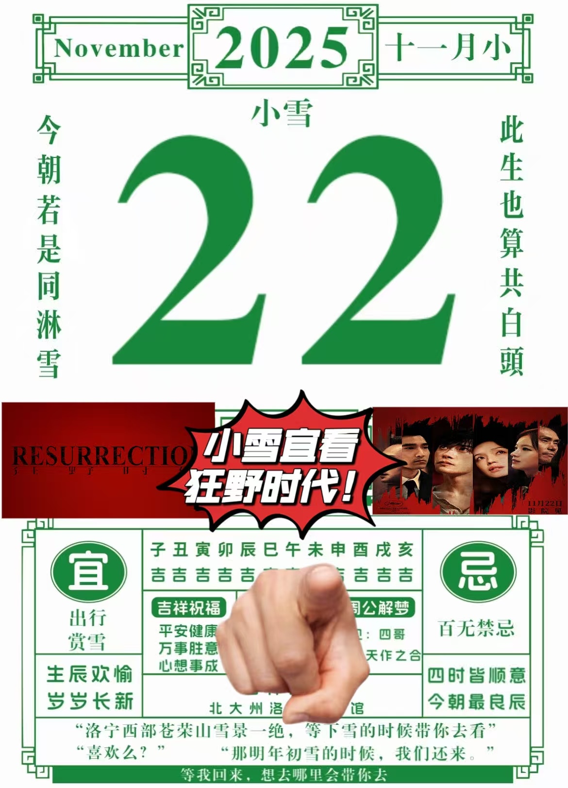 年轻人的仪式感是自己给的!在小雪这天的驱寒计划就是带上奶皮子糖葫芦、热腾腾的奶茶,前往电影院看《狂野时代》!能在大银幕看到绝美的雪景,味觉篇的雪景配上中式建筑,镜头里的东方禅意直接拉满,还有还俗小和尚在雪地里摆出的苦与甘(那里的雪拍得好漂亮!)❄️在大银幕上能看到这样的雪景真的太太太幸福了!除了雪景,《狂野时代》的看点还有很多!整个电影用几个故事串联起了迷魂者的梦境里,在所有人不愿意做梦,追求永生的时代里,只有他还在相信梦境,还在追求梦境。作为一个时代的异类,他在不同的故事里,不停生长,在镜子里发现了自我的雏形,在寺庙下和心里的苦和解,他感受到了爱与被爱。好希望无论过去多久,都有人会记着这个愿意做梦的迷魂者。外面的天气冷冷的,可《狂野时代》却看得人暖暖的~今日小雪就要看《狂野时代》!