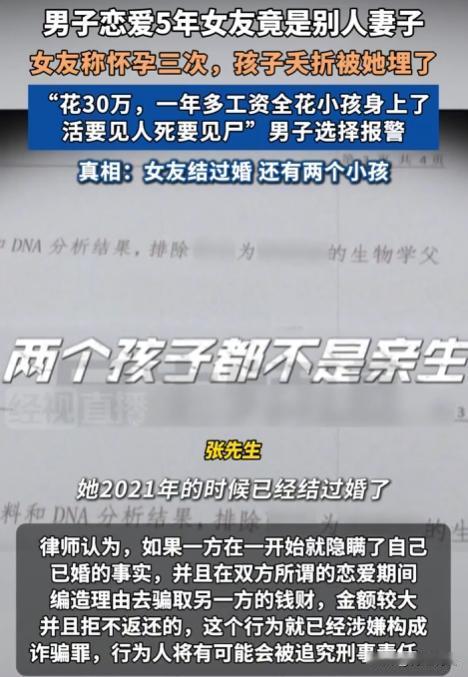 河南,男子和女友相恋5年,期间女友3次称怀孕,可孩子都没保住,男子为女友花了30多万,想见女友家人却总被拒,后来男子发现女友用假孕欺骗自己,愤怒带其到派出所,这才得知女友已婚还有2个孩子,女友称孩子是男子的,男子做亲子鉴定后发现都不是,意识到被骗后,决定走法律程序维权。 张先生,在2020年经人介绍认识了个女子,两人很快确定恋爱关系。 这恋爱一谈就是好几年,期间女子三次声称怀孕,张先生满心期待,可最后孩子都没保住。 他前前后后为女友花了30多万,想见女友家人,却总被各种理由拒绝。 直到后来,他才发现自己被骗得彻底。 2021年,两人刚恋爱没多久,女子就说自己怀孕了,要回家养胎。 张先生一听,立马承担起所有孕期开销,前后转给女子4万多。 可七八个月时,女子突然说孩子缺氧没保住。 张先生想看看孩子,女子死活不让,也不告诉他住哪,之后两人联系就渐渐少了。 到了2023年初,女子又主动联系张先生,两人很快就和好了。 没过多长时间,女子再次称自己怀孕,张先生满心欢喜地期待着新生命的到来。 可才三个月,女子就说自己是宫外孕,孩子打掉了。 张先生虽有疑惑,但也没多说什么。 时间来到2024年8月,女子第三次说怀孕了,张先生一直盼着孩子出生。 可到了2025年10月,孩子还是没生下来。 张先生开始怀疑女子是不是根本就没怀孕,他越想越不对劲,一气之下拉着女子就去了派出所。 在派出所里,张先生跟着女子回了家,见到了女子的母亲。 这一见,张先生彻底懵了。 女子的母亲告诉他,女子早在2021年就已经结婚,还有两个孩子。 张先生质问女子怎么回事,女子承认B超单是P的,还说老小可能是张先生的。 张先生哪能相信,拉着女子就去做亲子鉴定。 结果出来,两个孩子都不是他的。 张先生这才意识到,自己被这个女子骗得团团转,这30多万花得实在冤枉。 这事,搁谁身上能不气愤呢? 张先生心甘情愿地付出,期待和女子组建家庭,生儿育女。 可女子,却用假怀孕来欺骗他,还隐瞒自己已婚有孩的事实。 这30多万,就这么被女子骗走了,换做谁,都咽不下这口气。 张先生决定走法律程序,要回自己的钱。 女子虚构怀孕、伪造B超单,还隐瞒已婚有孩的事实,让张先生陷入错误认知,持续给她转账30多万。 张先生觉得自己的权益受到了严重侵害,必须讨个说法。 那么,女子的行为到底在法律上该怎么认定呢?张先生又能不能要回这些钱呢? 女子的行为,妥妥地构成民事欺诈。 民事欺诈是指一方故意告知对方虚假情况,或者故意隐瞒真实情况,诱使对方作出错误意思表示的行为。 女子多次虚构自己怀孕的事实,还伪造B超单,让张先生误以为她真的怀孕了,并且会和自己组建家庭、生儿育女。 基于这种错误的认识,张先生才会心甘情愿地为她花钱,承担各种开销。 根据《民法典》第148条规定,一方以欺诈手段,使对方在违背真实意思的情况下实施的民事法律行为,受欺诈方有权请求人民 法 院 或者仲裁机构予以撤销。 女子通过欺诈手段,让张先生在违背自己真实意愿的情况下,给她转了30多万。这些转账行为,从法律上来说,是可以被撤销的。 张先生作为受欺诈方,可以依据这条法律起诉女子,要求撤销转账行为,返还全部转账款项。 而且女子这种行为,还可能涉及刑事诈骗。 如果女子以非法占有为目的,用虚构事实或者隐瞒真相的方法,骗取数额较大的公私财物,就构成诈骗罪。 诈骗罪立案标准一般是数额较大,三千元至一万元以上。 张先生转了30多万,远超这个标准。 要是认定女子构成诈骗罪,她不仅要返还钱财,还可能面临刑事处罚。 张先生能不能要回全部转账款项呢? 女子的欺诈行为,使得张先生陷入了错误的认识,从而做出了转账的行为。 这种转账行为并不是张先生的真实意愿表达,而是受到了女子的欺诈。 所以,张先生有权要求女子返还全部转账款项。 女子说老小可能是张先生的,这会不会影响判决呢? 亲子鉴定已经明确显示,两个孩子都不是张先生的。 这就说明女子所说的老小可能是张先生的,完全是虚假陈述,是为了继续欺骗张先生,让他继续给她花钱。 这种虚假陈述,更加坐实了女子的欺诈行为。 女子隐瞒自己已婚有孩的事实,这在法律上算什么? 这同样属于欺诈行为,婚姻状况是一个人的重要信息,女子在和张先生恋爱期间,隐瞒自己已婚有孩的事实,让张先生误以为她是单身,可以和自己组建家庭。 这种隐瞒行为,也是导致张先生陷入错误认识的重要原因之一。 综合来看,女子的行为在法律上构成了民事欺诈,张先生有权依据民法典第148条的规定,起诉女子,要求她返还全部转账款项。 女子的行为实在是不道德,更是违法的。 她为了满足自己的私欲,不惜欺骗他人的感情和金钱,这种行为应该受到法律的制裁。