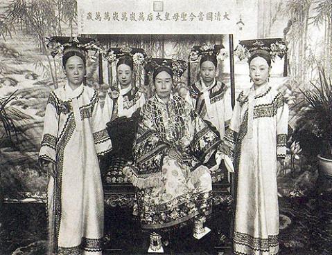 这张晚清宫廷合影以慈禧太后为核心,照片左起依次为御前女官(作家)裕德龄、庆亲王奕劻之女四格格、慈禧、慈禧内侄媳元大奶奶、中国近现代舞蹈先驱裕容龄(德龄之妹)。 1900 年八国联军侵华后,清廷亟需修复国际形象与内部权威,这张合影既通过 “万岁” 横幅强化慈禧的皇权合法性,又借德龄姐妹(西方文化窗口)、四格格(权臣庆亲王家族代表)、元大奶奶(宗亲势力)的组合,展现其权力圈层的多元构成。